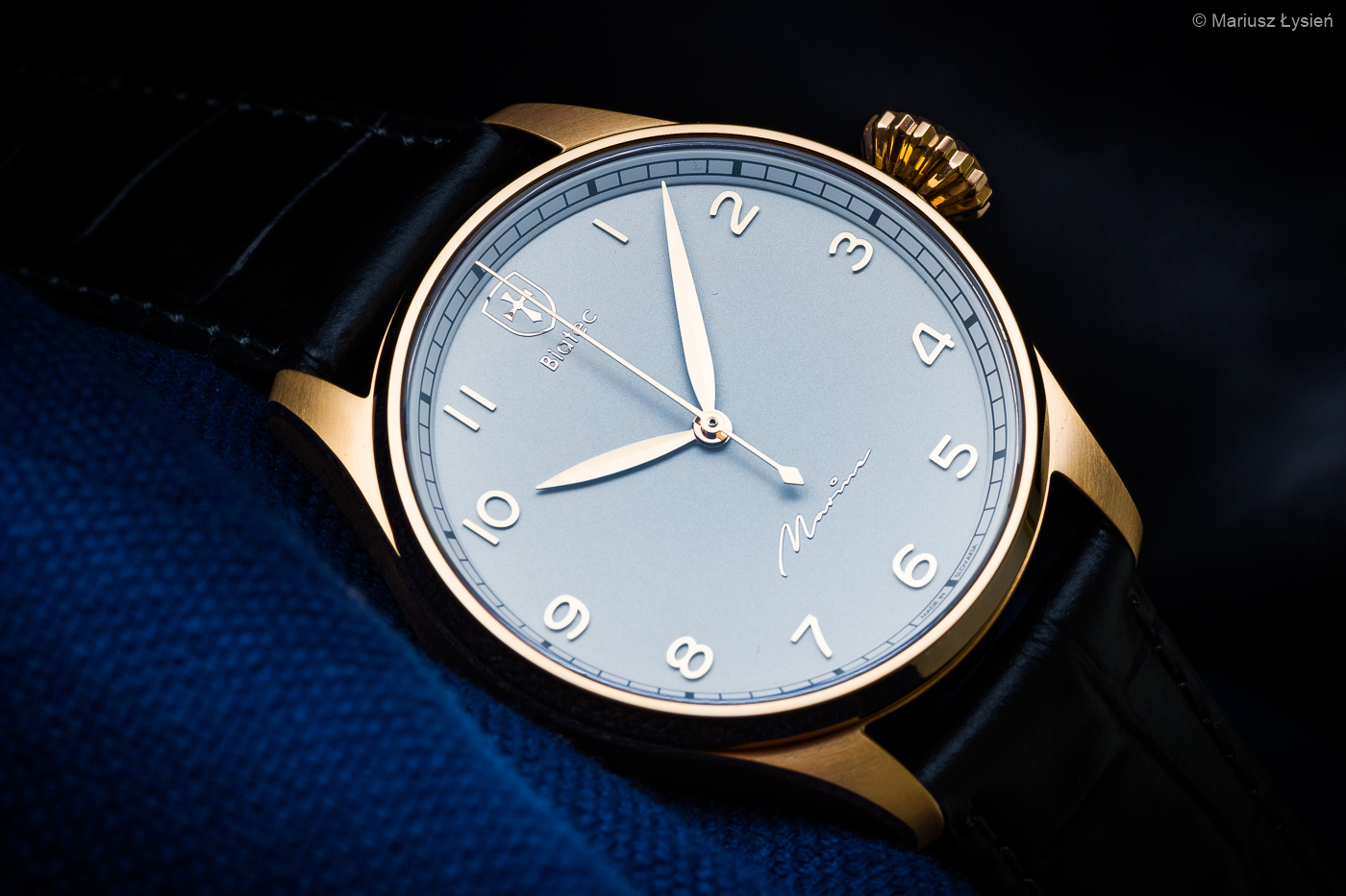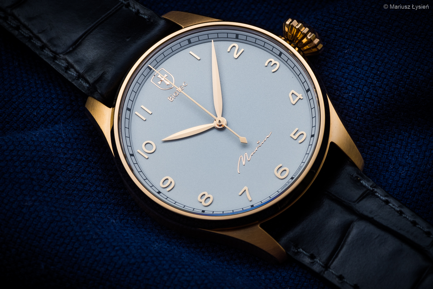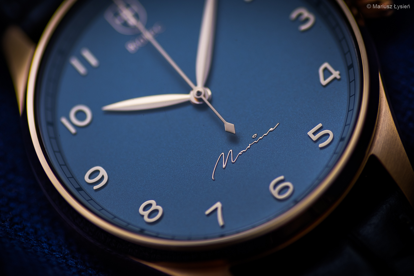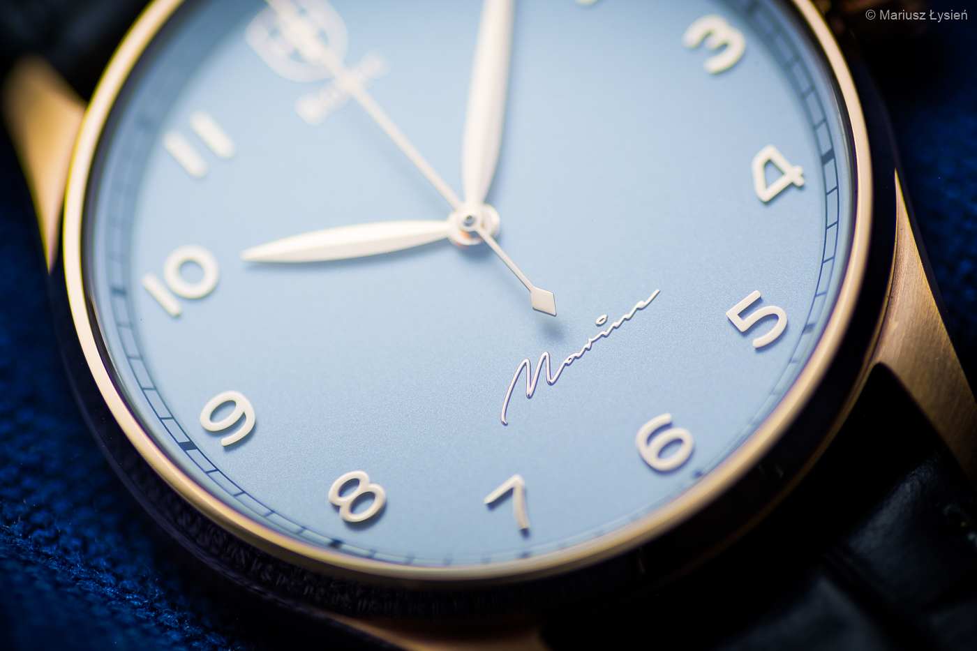 Na srebrzystej powierzchni cyferblatu umieszczono delikatną podziałkę typu „railroad” oraz nakładane indeksy godzinowe. Interesująco prezentuje się powierzchnia tarczy w zależności od ilości światła padającego na niej – starałem się to pokazać na zdjęciach. Indeksy jak i centralnie osadzone wskazówki wykonano z różowego złota, aby dopasować je kolorystycznie do koperty zegarka. Estetycznie wkomponowane logo producenta na godzinie 12 doskonale stapia się z pozostałymi elementami na tarczy. Całość dopełnia ciekawie zaprojektowany krój napisu „Marine”.