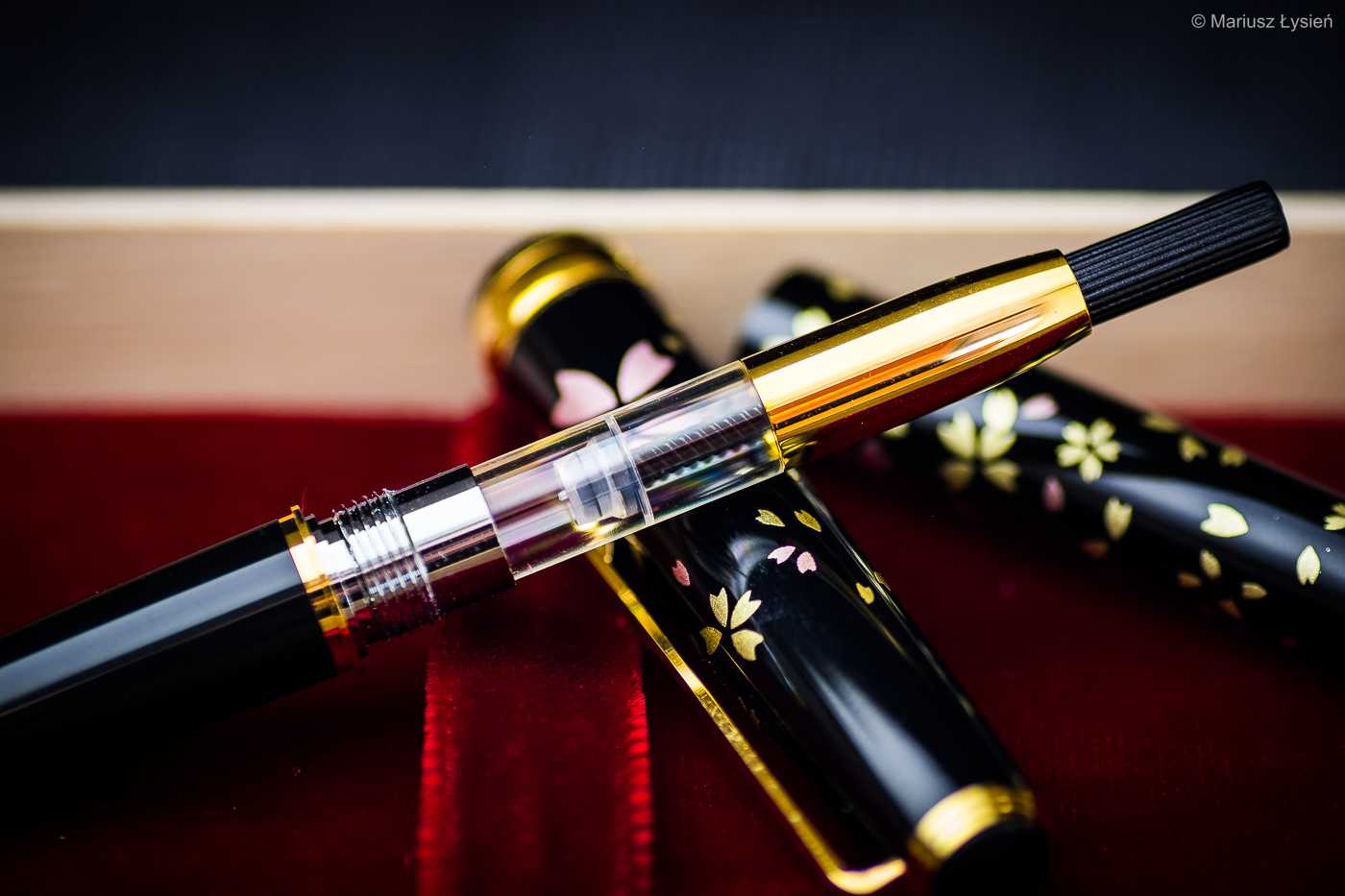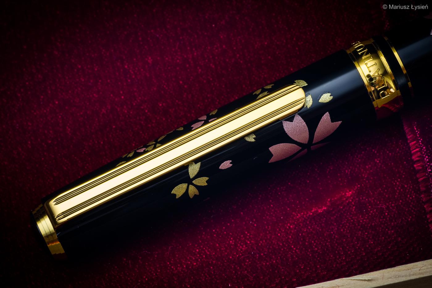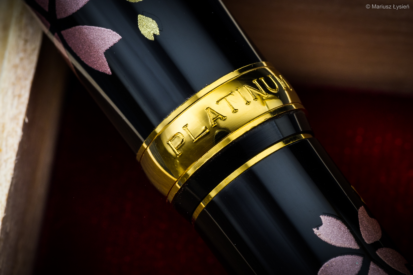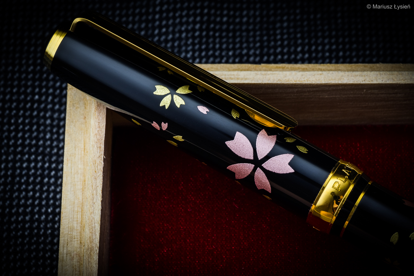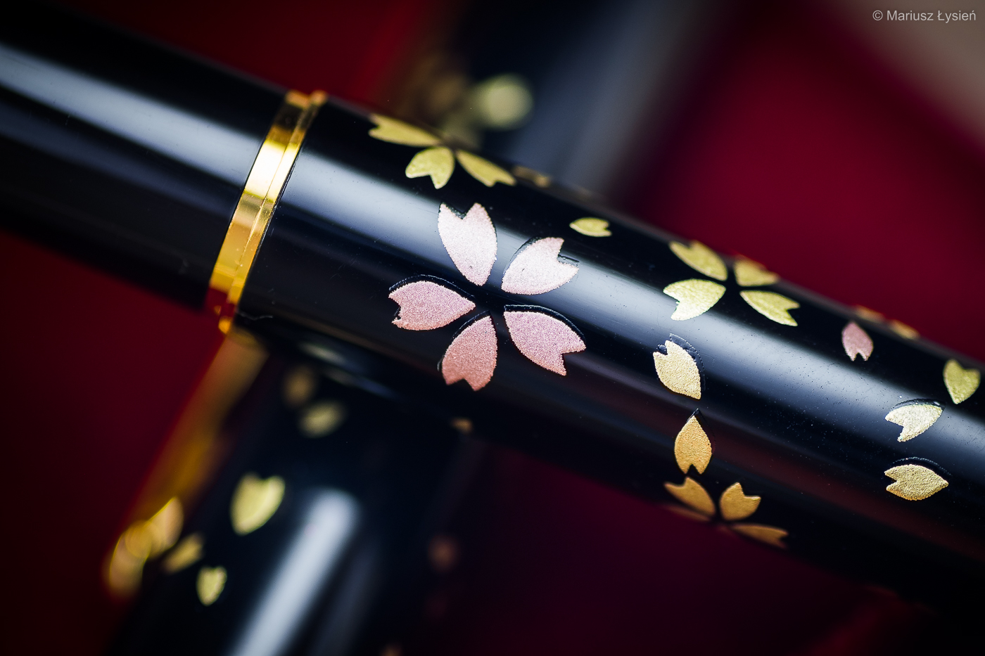 Na czarnej powierzchni korpusu oraz skuwki naniesiono wzór mający przypominać kwiaty wiśni wraz z tańczącymi na wietrze płatkami. Dwubarwne kwiaty delikatnie połyskują na czarnej powierzchni prezentując się przy tym elegancko. To cecha wielu produktów japońskich, w przypadku których doskonale sprawdza się powiedzenie „mniej znaczy więcej”. Florystyczny motyw zupełnie nie ogranicza oficjalnego i eleganckiego wyrazu pióra. Oczywiście znacznie niższa cena końcowego produktu pociąga za sobą pewne ograniczenia – motyw nie jest tak przestrzenny (wypukły) jak w przypadku znacznie droższych odpowiedników. Ilość dodatkowych detali (takich jak cieniowanie poszczególnych płatków, dodatkowe elementy liści oraz brak pozostałych elementów środowiska) również została mocno ograniczona. Ilość warstw oraz idący za tym czas schnięcia czy też nakład pracy muszą być skromniejsze. Motyw jednak jak wspomniałem nie traci przez to jednak nic ze swojej elegancji. Można by nawet napisać, że znajdą się klienci, który właśnie będą preferowali taką geometryczną ornamentykę ponad bardziej realistyczne kreacje.