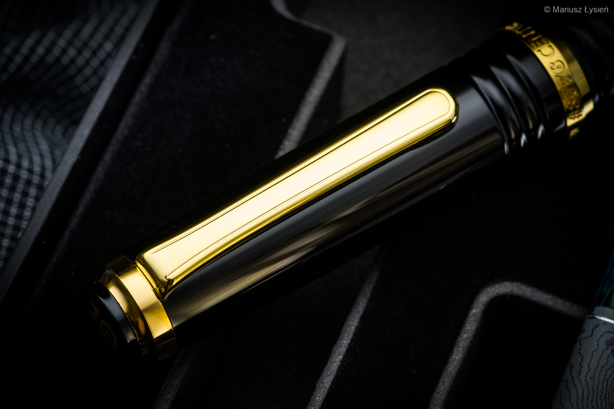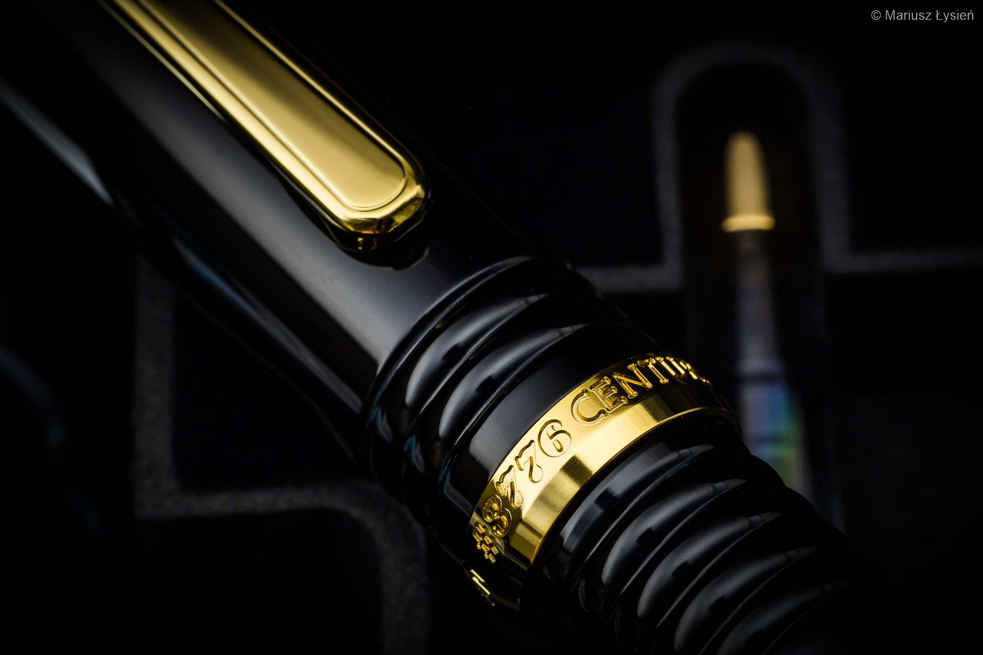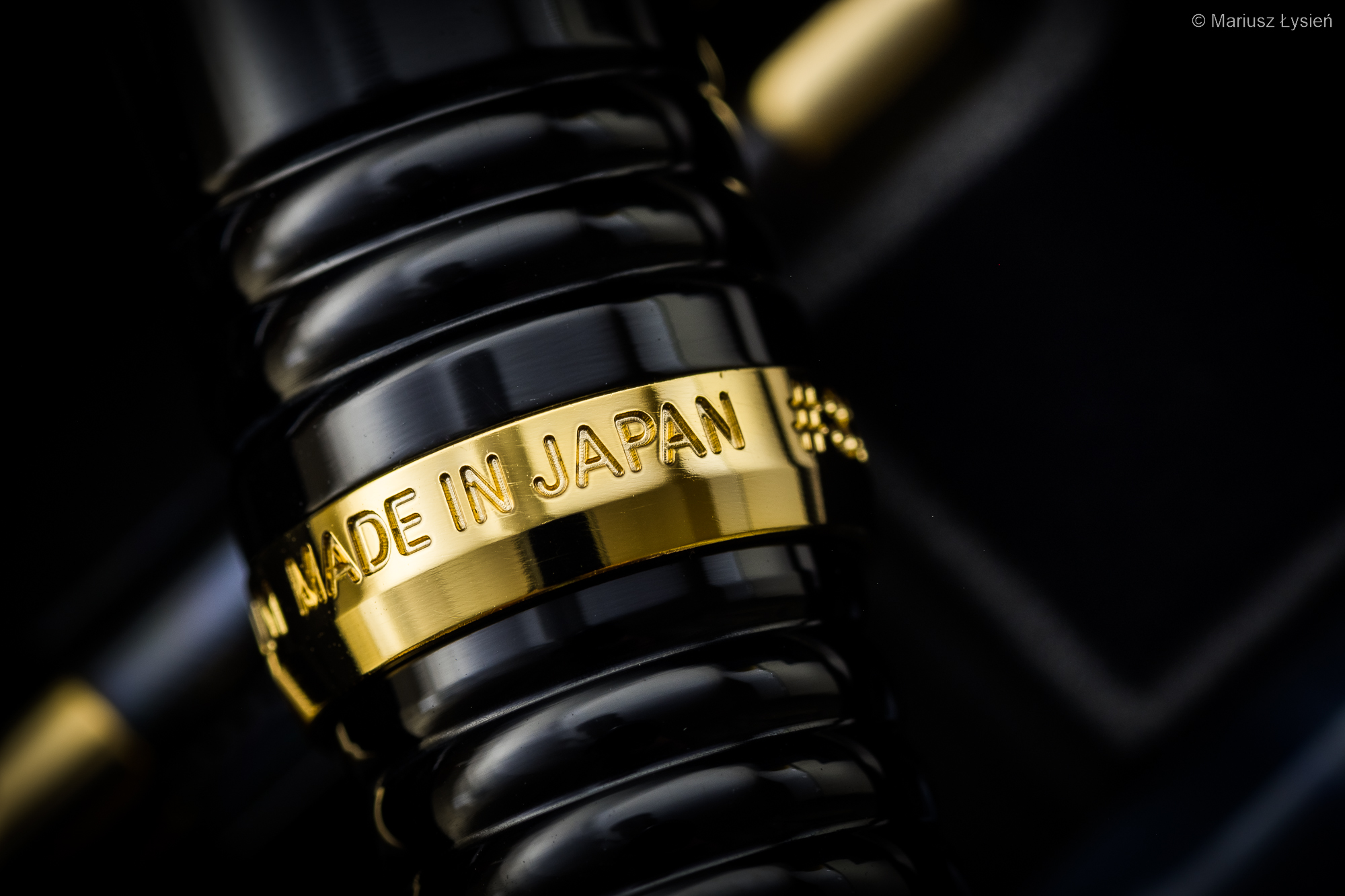 Modele Platinum #3776 prezentowaliśmy już kilkukrotnie na łamach Zegarki i Pióra. Tytułowe pióro wieczne nie jest jednak typowym przedstawicielem linii #3776. Tak naprawdę czerpie ono pełnymi garściami z pierwowzoru, a przypomnieć należy, że linia ta powstała już w 1978 roku. Wykonany z czarnego tworzywa korpus oraz skuwka nie zostały na końcach zaoblone – zamiast tego końcówki pióra są praktycznie płaskie. Podobny zabieg dotyczy pierścieni uformowanych zarówno na skuwce jak i na korpusie. Pierścienie te nawiązują do początków produkcji, a oryginały z tzw. „epoki” wyposażone w podobne korpusy osiągają na rynku wtórnym całkiem konkretne ceny. W połączeniu z czarno-złotą kolorystyką, całość prezentuje się niezwykle klasycznie i elegancko. Na szczycie skuwki umieszczono logo zaprojektowane z okazji 10 rocznicy – to samo które odnajdziemy na opakowaniu. Na pierścieniu skuwki umieszczono podstawowe informacje dotyczące producenta, serii oraz kraju produkcji.