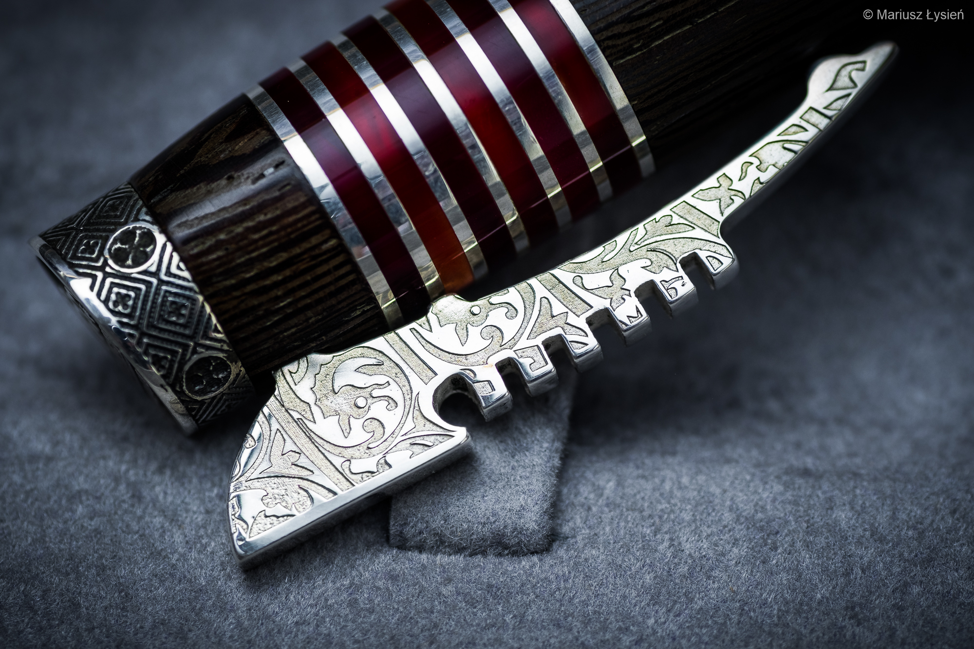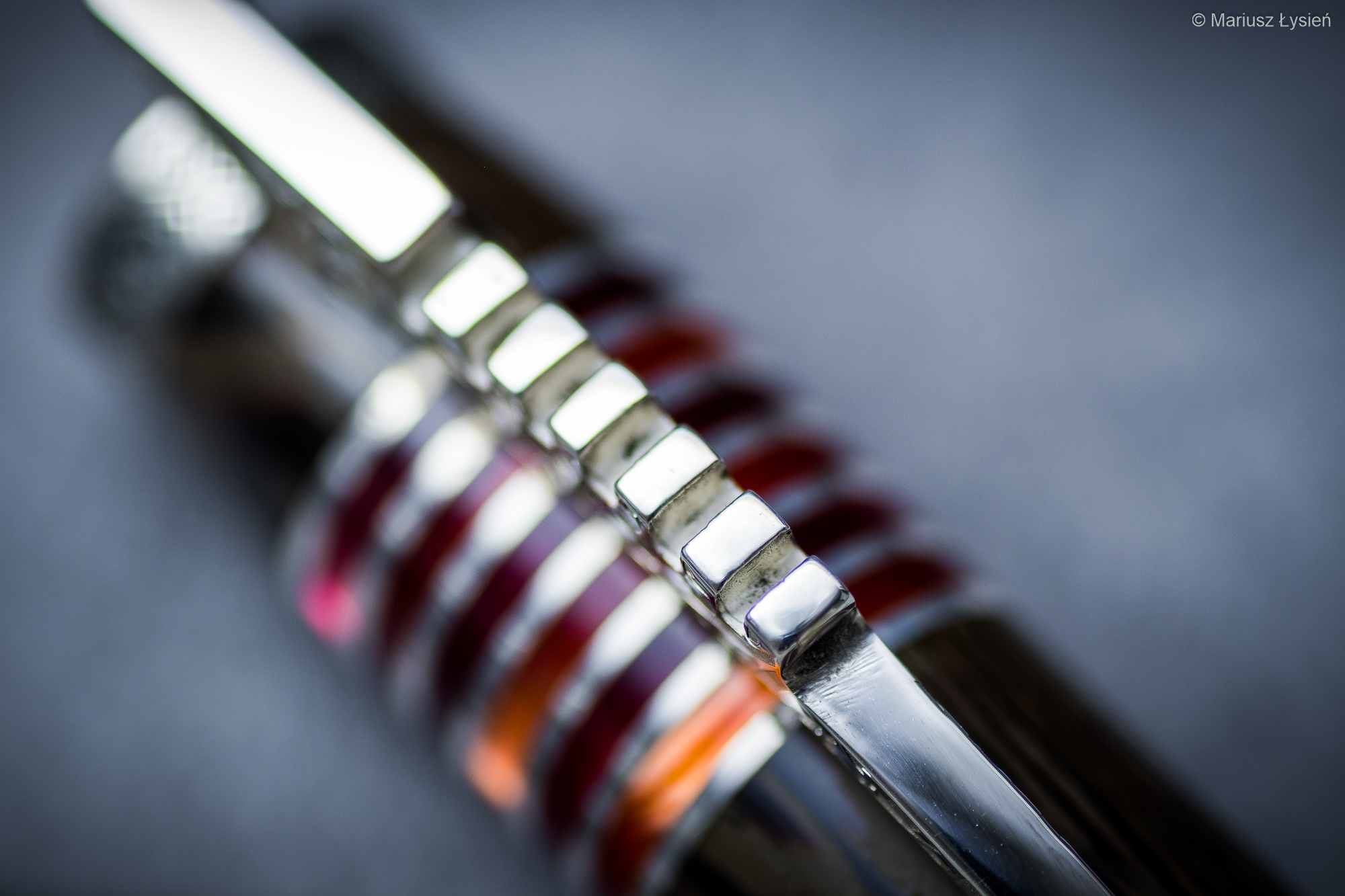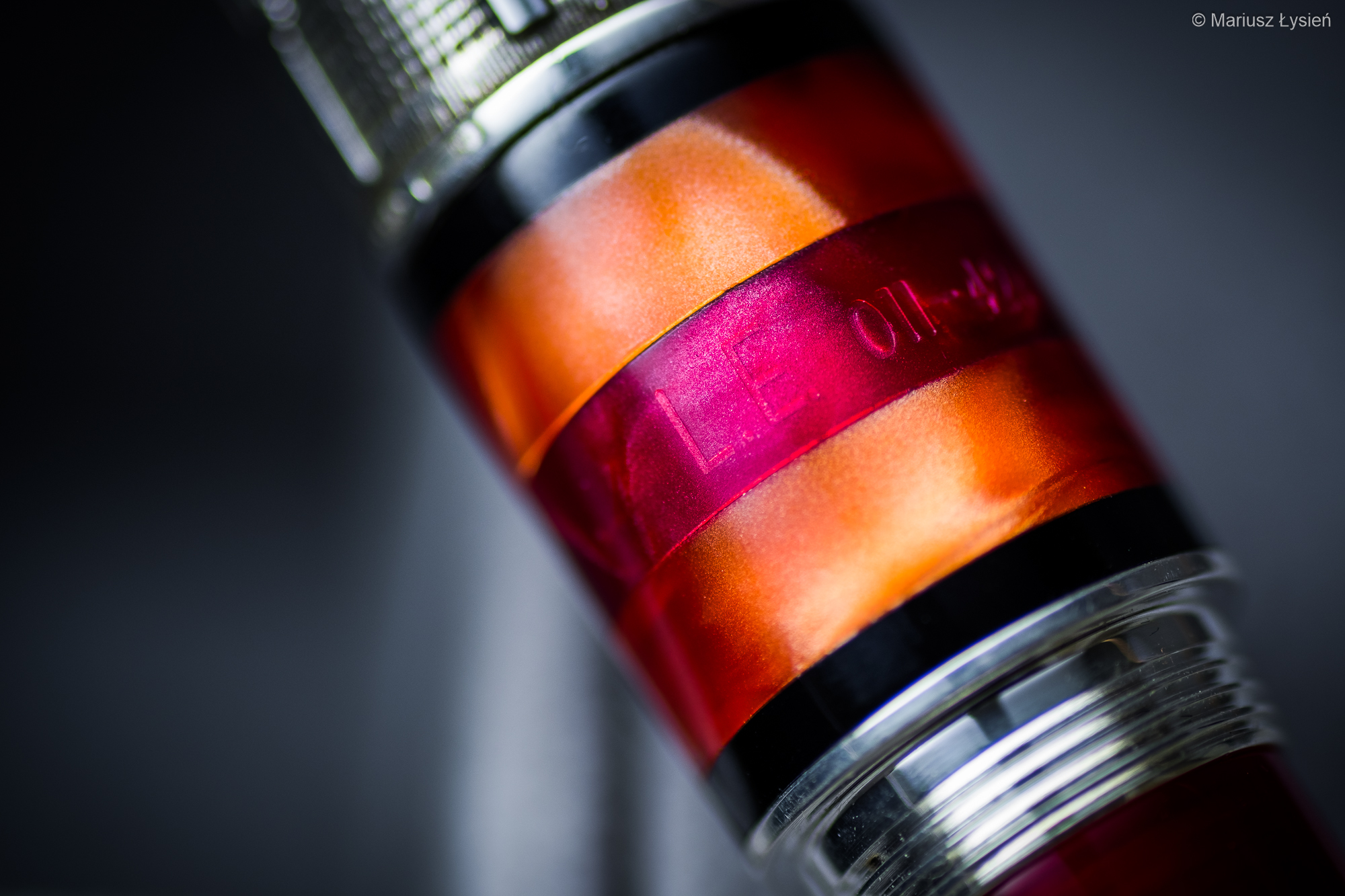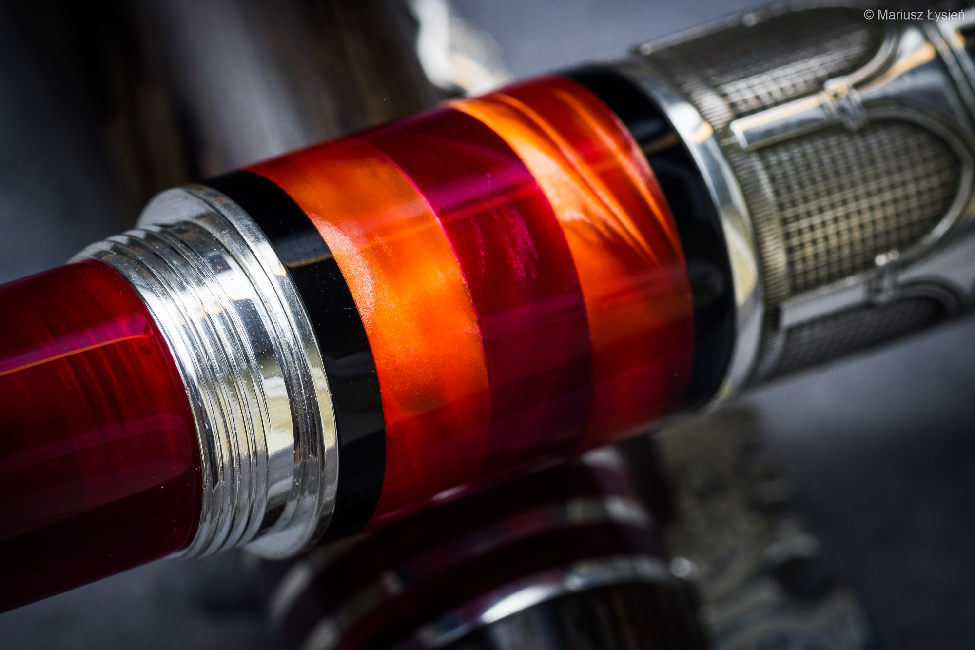 Wykonana z metalu sekcja jest wygodna podczas trzymania pióra. Umieszczony za nią gwint wraz z niewielkim uskokiem nie powodują dyskomfortu podczas trzymania pióra w dłoni. Podobny gwint umieszczono również na zakończeniu pióra – dzięki niemu możemy w pewny sposób zamocować skuwkę. Przyznam jednak, że pióro jest na tyle duże, że raczej nieliczne osoby skorzystają z takiej możliwości. Na zakończeniu pióra umieszczono również tzw. „ślepą skuwkę”, pod którą znajduje się element służący do obsługi systemu napełniania. Jeżeli chodzi o rodzaj zastosowanego mechanizmu, to jest to wewnętrzny system piston filler.