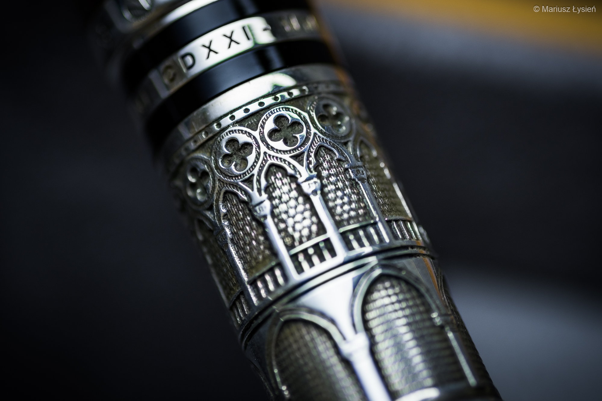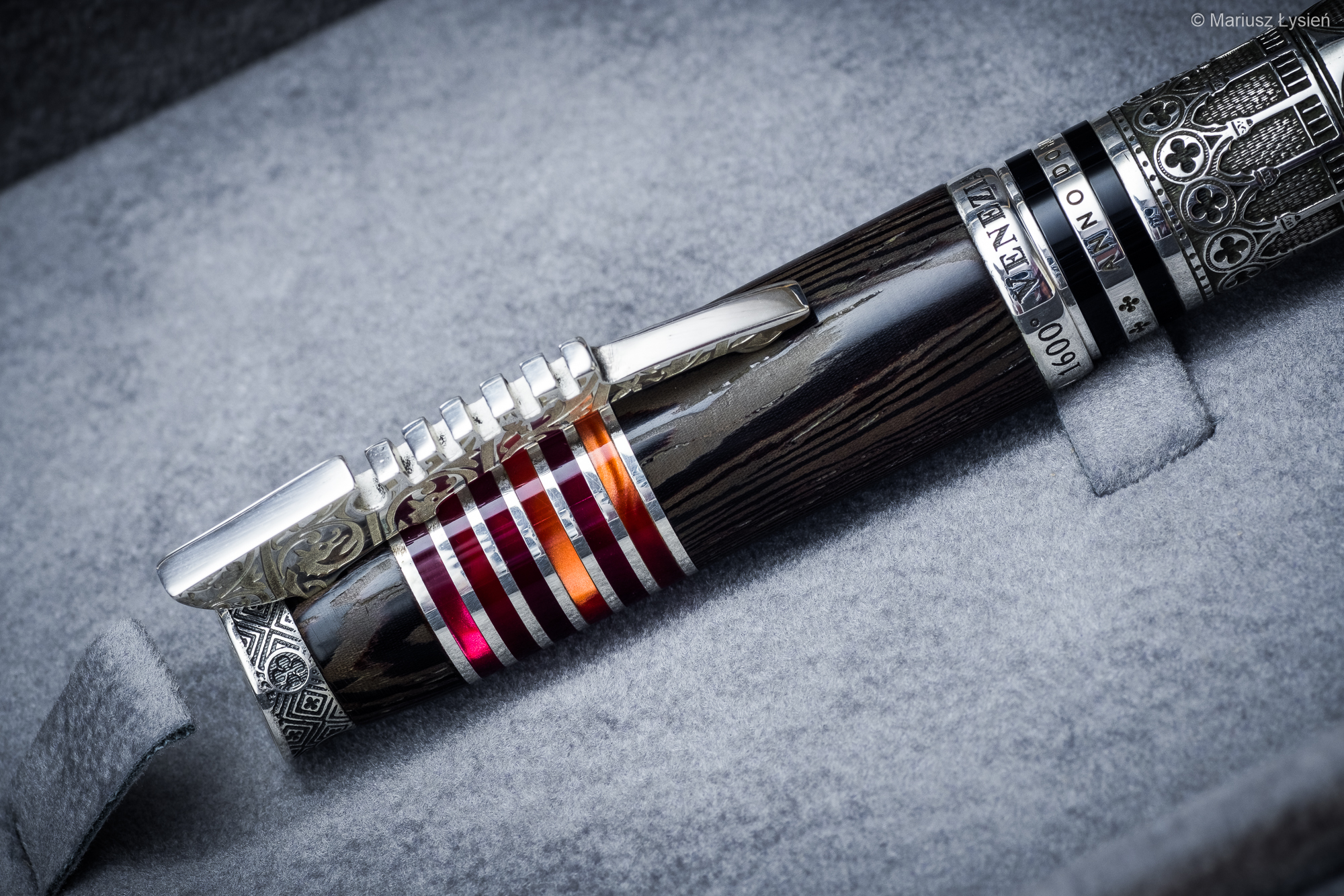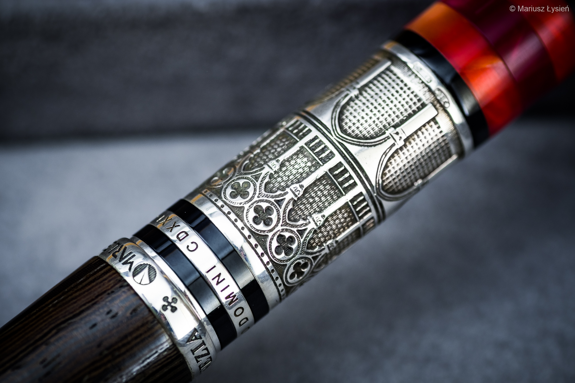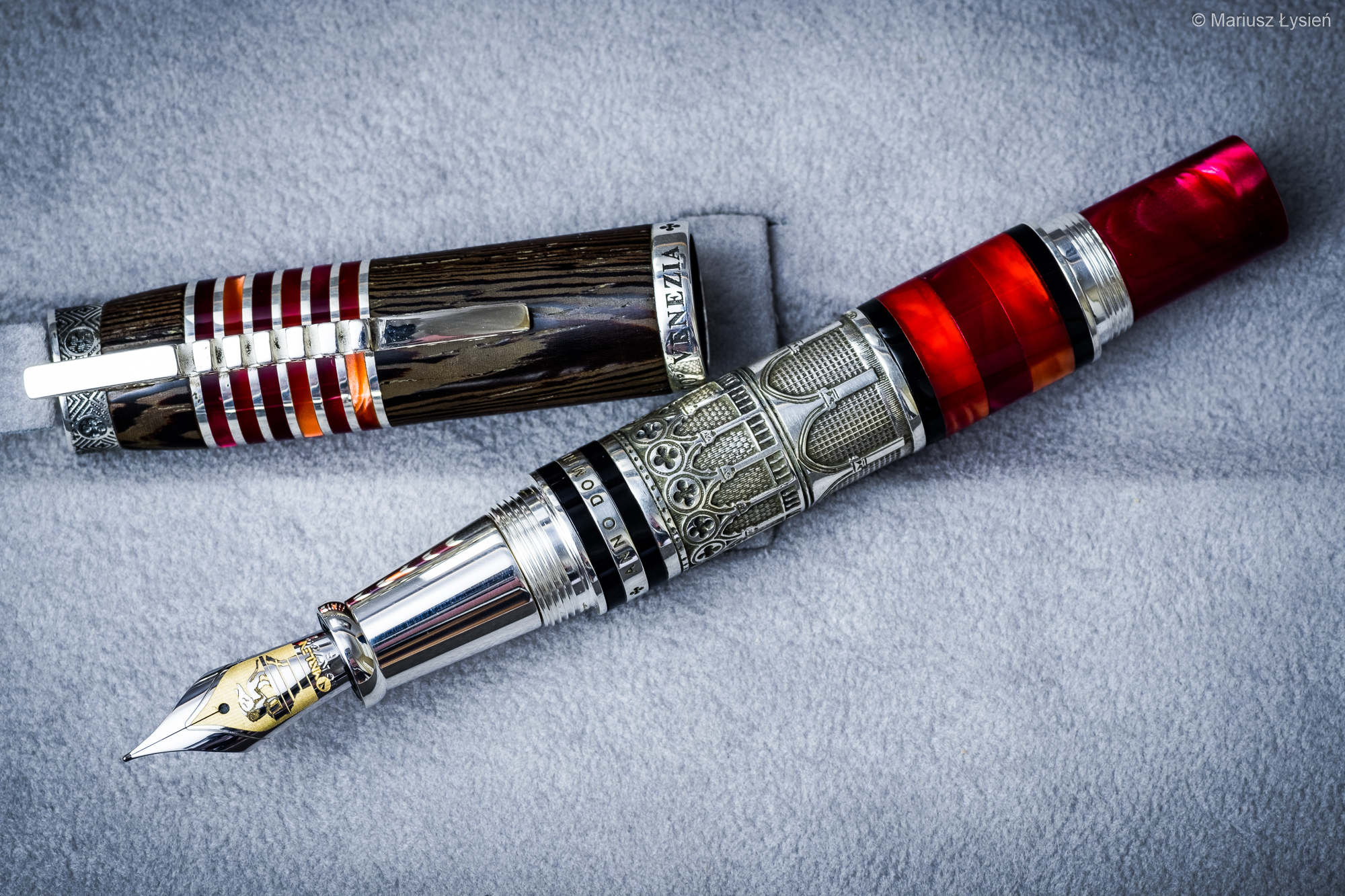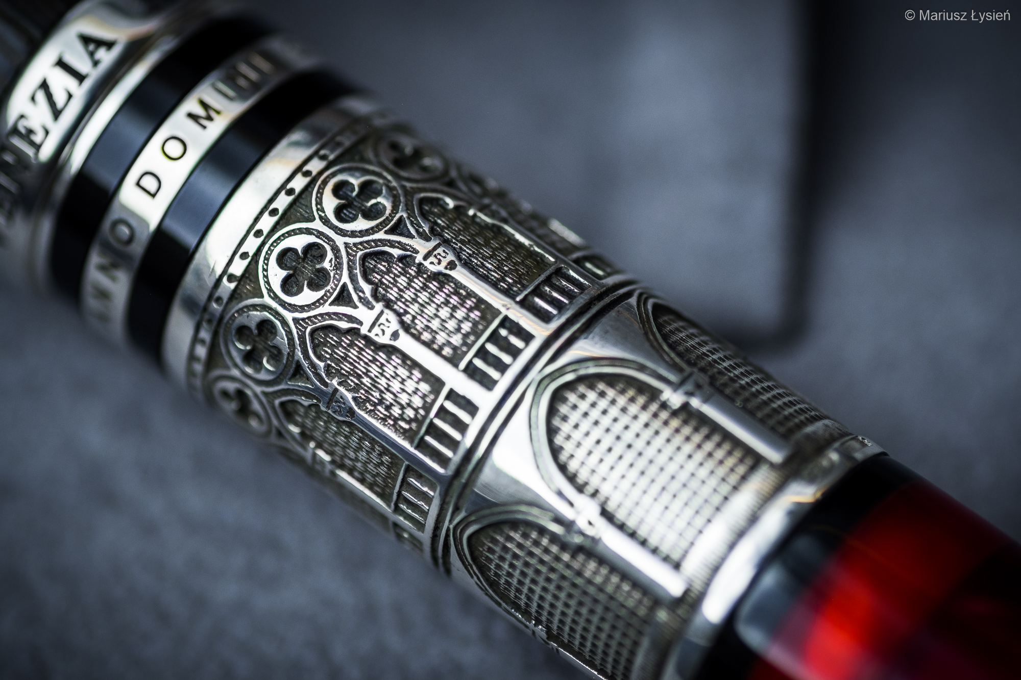 Pióro wykonano z drewna, szlachetnej żywicy oraz srebra (przygotowano również wersję pozłacaną). Klasyczny, cylindryczny kształt nawiązuje do kolumn, które pojawiają się w licznych obiektach architektonicznych w mieście. Dobór kolorystyki, faktur czy też ornamentyki jest doskonałym przykładem analizy tematyki, której poświęcona jest dana edycja przyboru piśmienniczego. Możemy się jednak domyślać, że ciemne drewno nawiązuje chociażby do elementów, które podtrzymują zdecydowaną większość budynków Wenecji. Jego barwa i faktura doskonale podkreślają również pierścienie wykonane z kolorowej żywicy oraz główny element korpusu, na powierzchni którego wygrawerowano fragment elewacji Pałacu Dożów – obiektu będącego jednym z najważniejszych zabytków Wenecji.