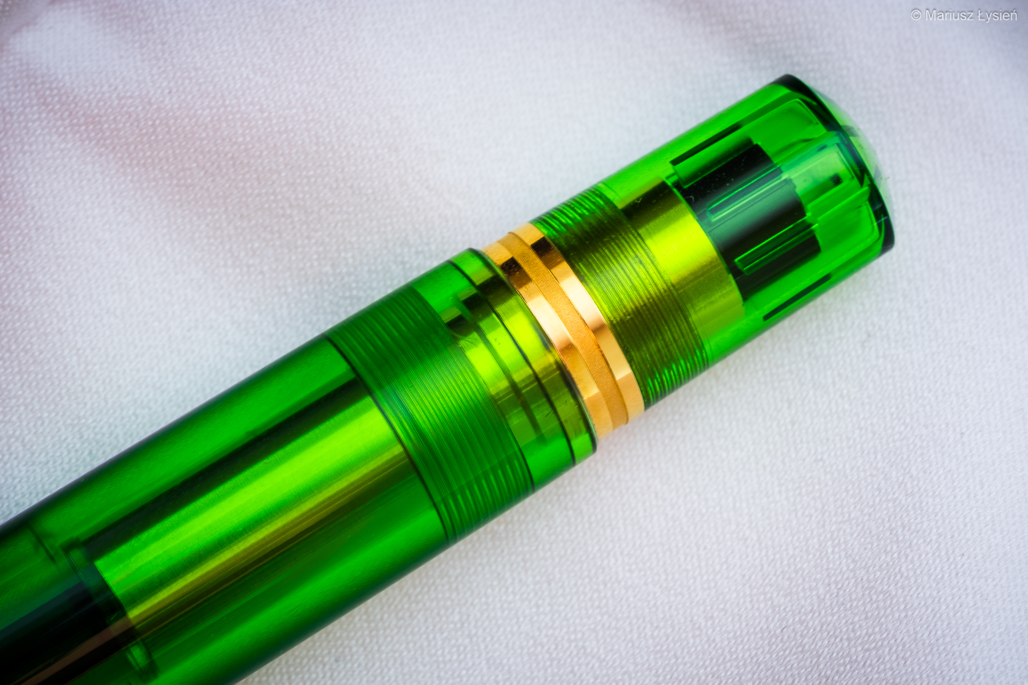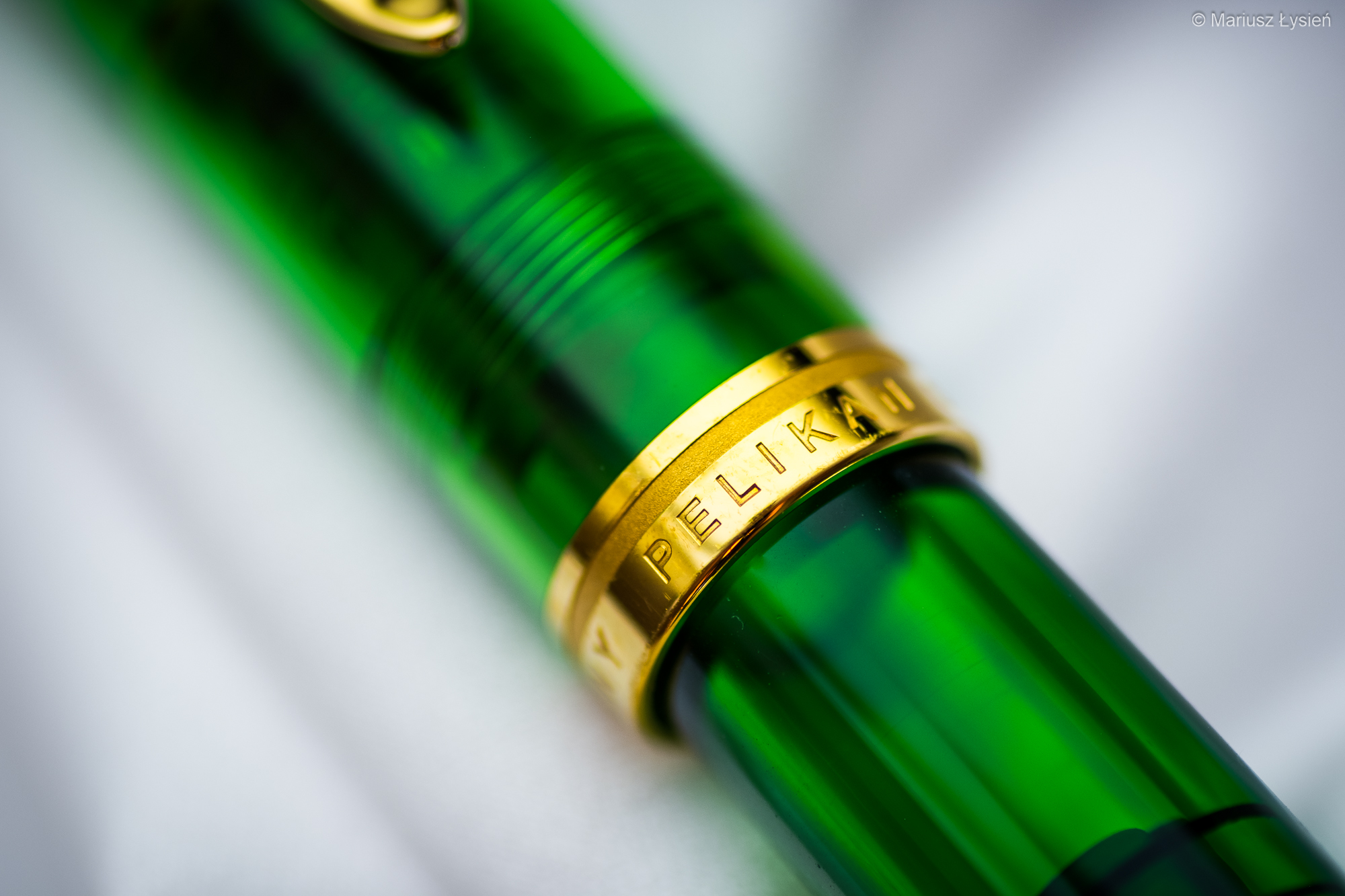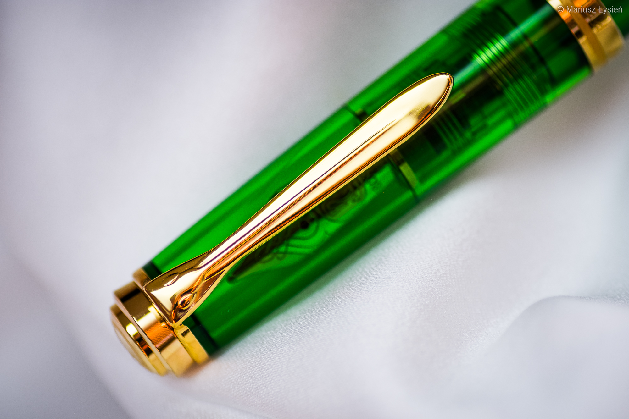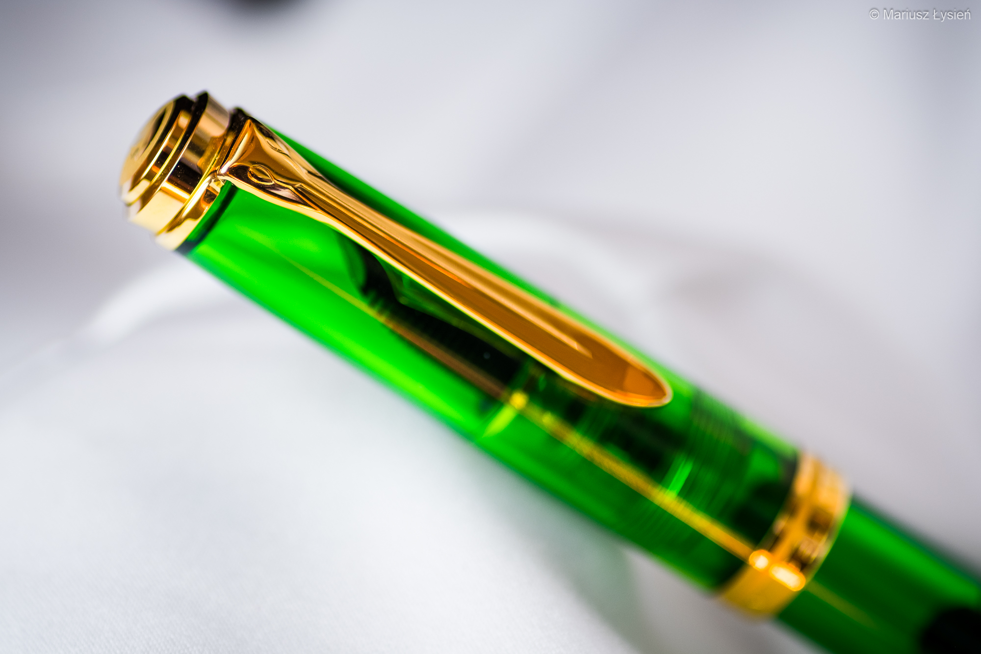 Co mogę napisać w porównaniu do powyższych o tytułowym wariancie? Z pewnością jest to pióro dosyć specyficzne. Nie każdemu przypadnie do gustu tak mocno transparentne pióro, podobnie jak jego kolorystyka. Mnie urzekło do tego stopnia, że decyzja o zakupie była wręcz błyskawiczna – w tym miejscu jeszcze raz chciałem podziękować niezawodnemu sklepowi Twoje Pióro. Odcień zieleni wraz z pozłacanymi elementami metalowymi tworzy fantastyczne wrażenie. Barwa jest żywa i dokładnie taka jakiej bym oczekiwał – tzn odcień zieleni nie jest przesunięty w stronę żółtej ani tym bardziej niebieskiej dominanty. Bardzo lubię przybory piśmiennicze, które są kolorowe, dlatego tytułowe pióro urzekło mnie od razu. Doceniam „klasyczną czerń” jednak jest ona u mnie często jednym z ostatnich wyborów jeżeli chodzi o pióra wieczne. Wszystkie elementy gwintowane pracują bardzo dobrze – w przypadku wielu transparentnych materiałów odnosiłem wielokrotnie wrażenie, że mają one inną, nieco twardszą charakterystykę i nie pracują tak płynnie. W tym przypadku Pelikan poradził sobie bardzo dobrze. Sama żywica jest zresztą bardzo przyjemna w dotyku.