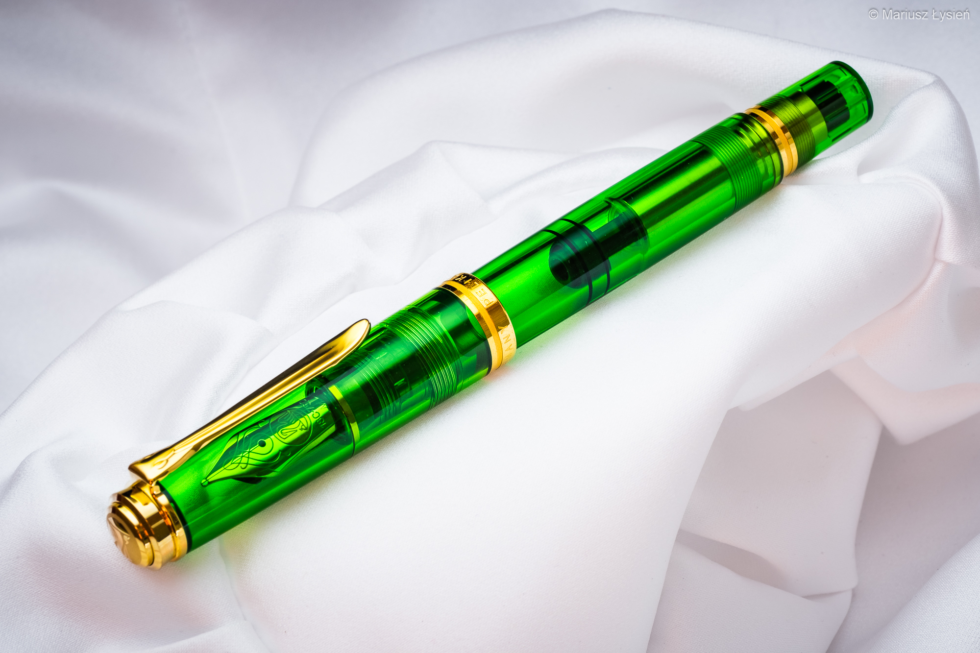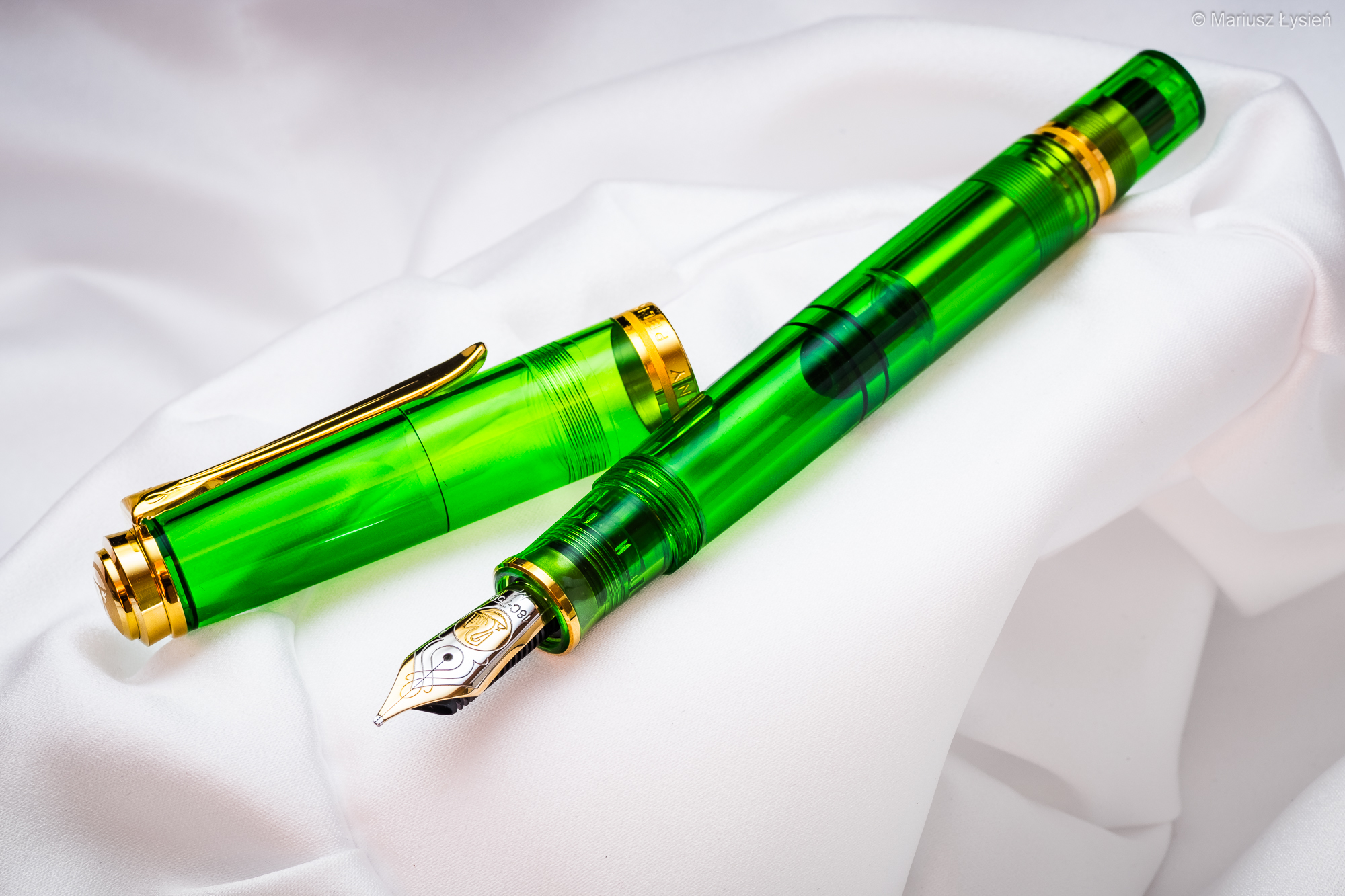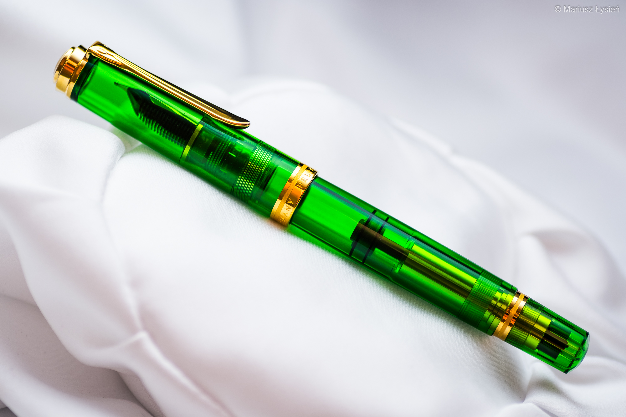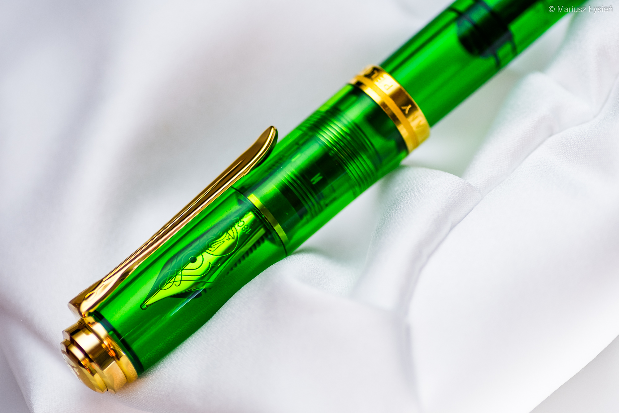 Co mogę napisać w porównaniu do powyższych o tytułowym wariancie? Z pewnością jest to pióro dosyć specyficzne. Nie każdemu przypadnie do gustu tak mocno transparentne pióro, podobnie jak jego kolorystyka. Mnie urzekło do tego stopnia, że decyzja o zakupie była wręcz błyskawiczna – w tym miejscu jeszcze raz chciałem podziękować niezawodnemu sklepowi Twoje Pióro. Odcień zieleni wraz z pozłacanymi elementami metalowymi tworzy fantastyczne wrażenie. Barwa jest żywa i dokładnie taka jakiej bym oczekiwał – tzn odcień zieleni nie jest przesunięty w stronę żółtej ani tym bardziej niebieskiej dominanty. Bardzo lubię przybory piśmiennicze, które są kolorowe, dlatego tytułowe pióro urzekło mnie od razu. Doceniam „klasyczną czerń” jednak jest ona u mnie często jednym z ostatnich wyborów jeżeli chodzi o pióra wieczne. Wszystkie elementy gwintowane pracują bardzo dobrze – w przypadku wielu transparentnych materiałów odnosiłem wielokrotnie wrażenie, że mają one inną, nieco twardszą charakterystykę i nie pracują tak płynnie. W tym przypadku Pelikan poradził sobie bardzo dobrze. Sama żywica jest zresztą bardzo przyjemna w dotyku.