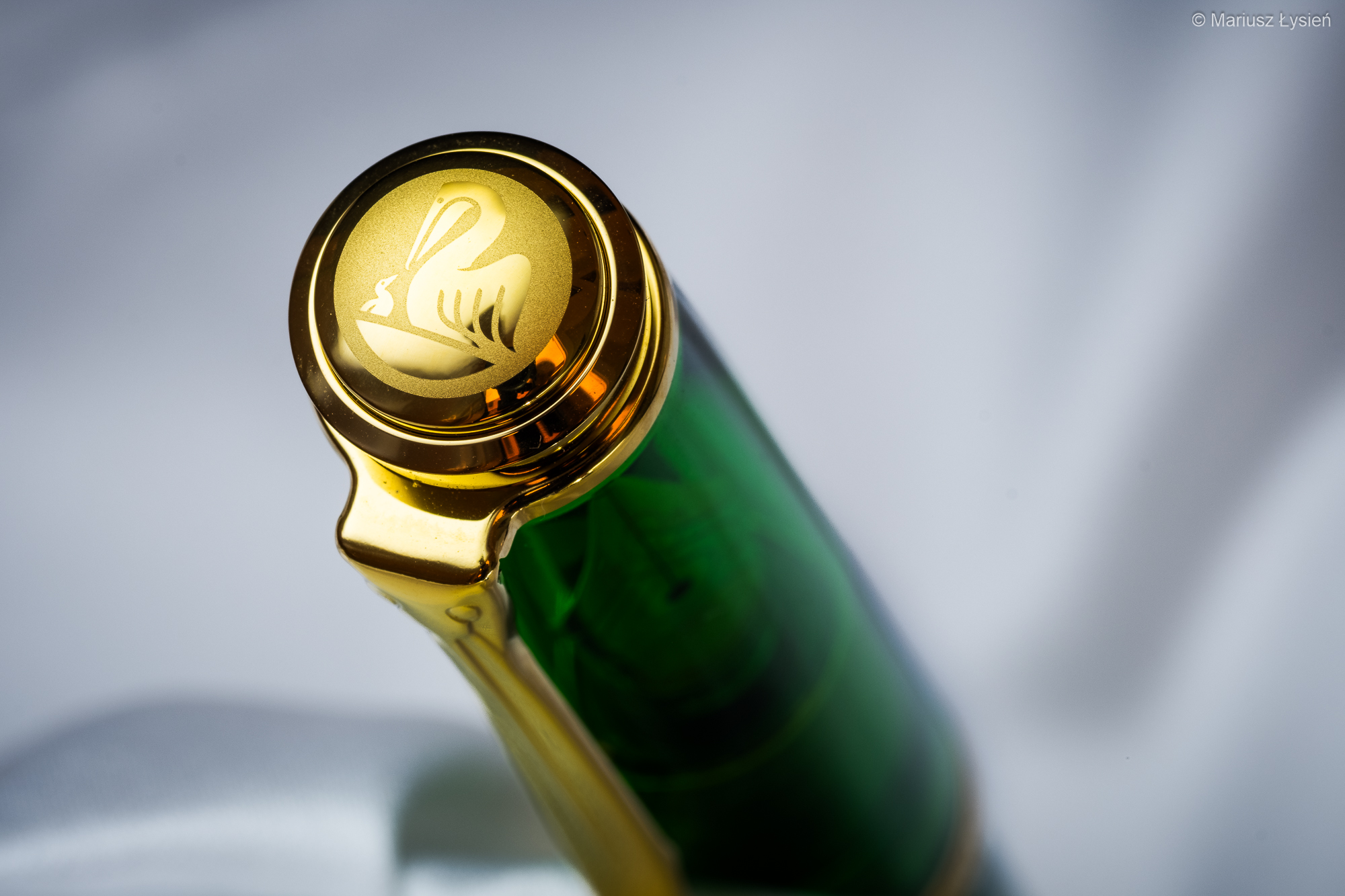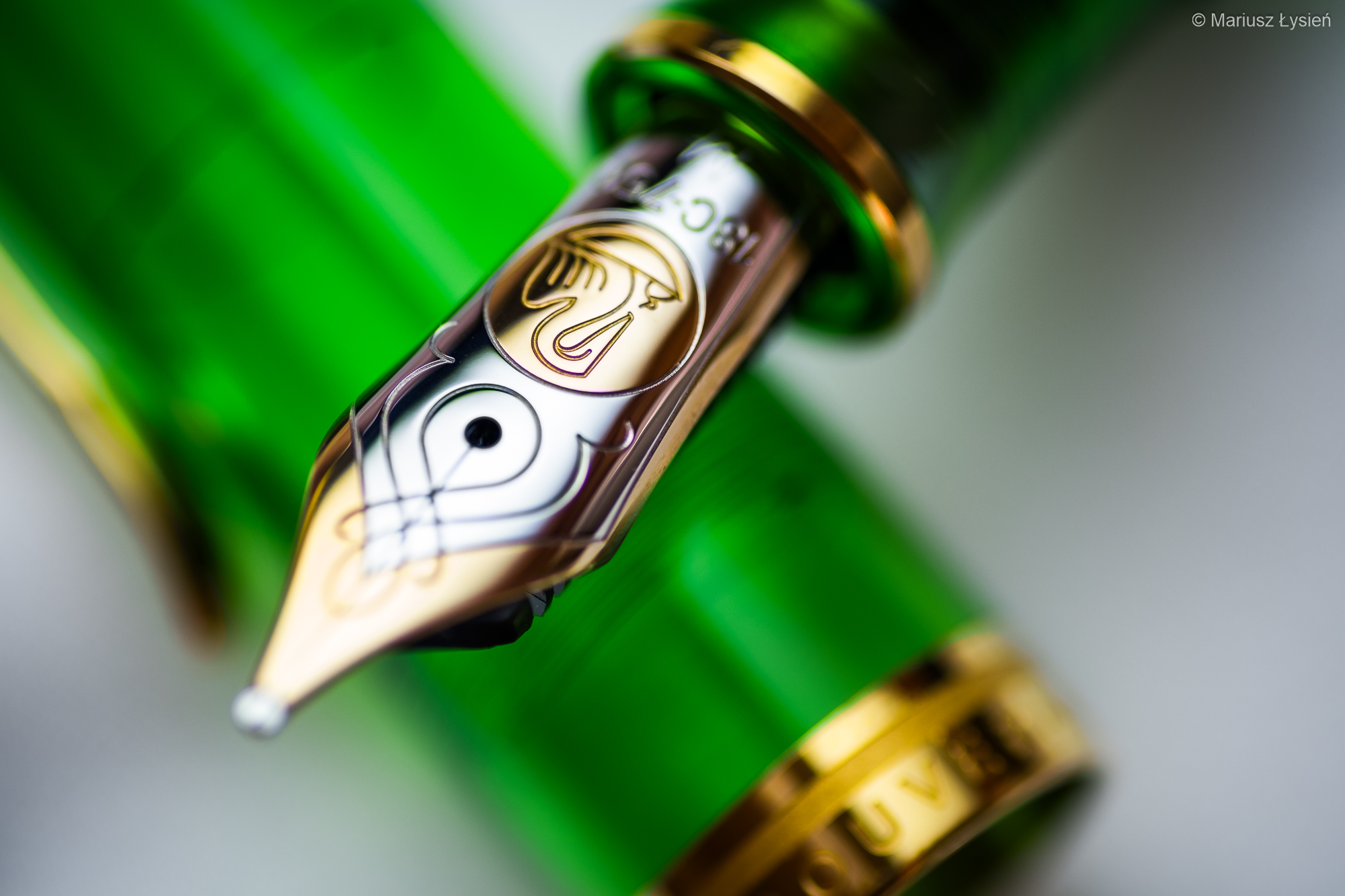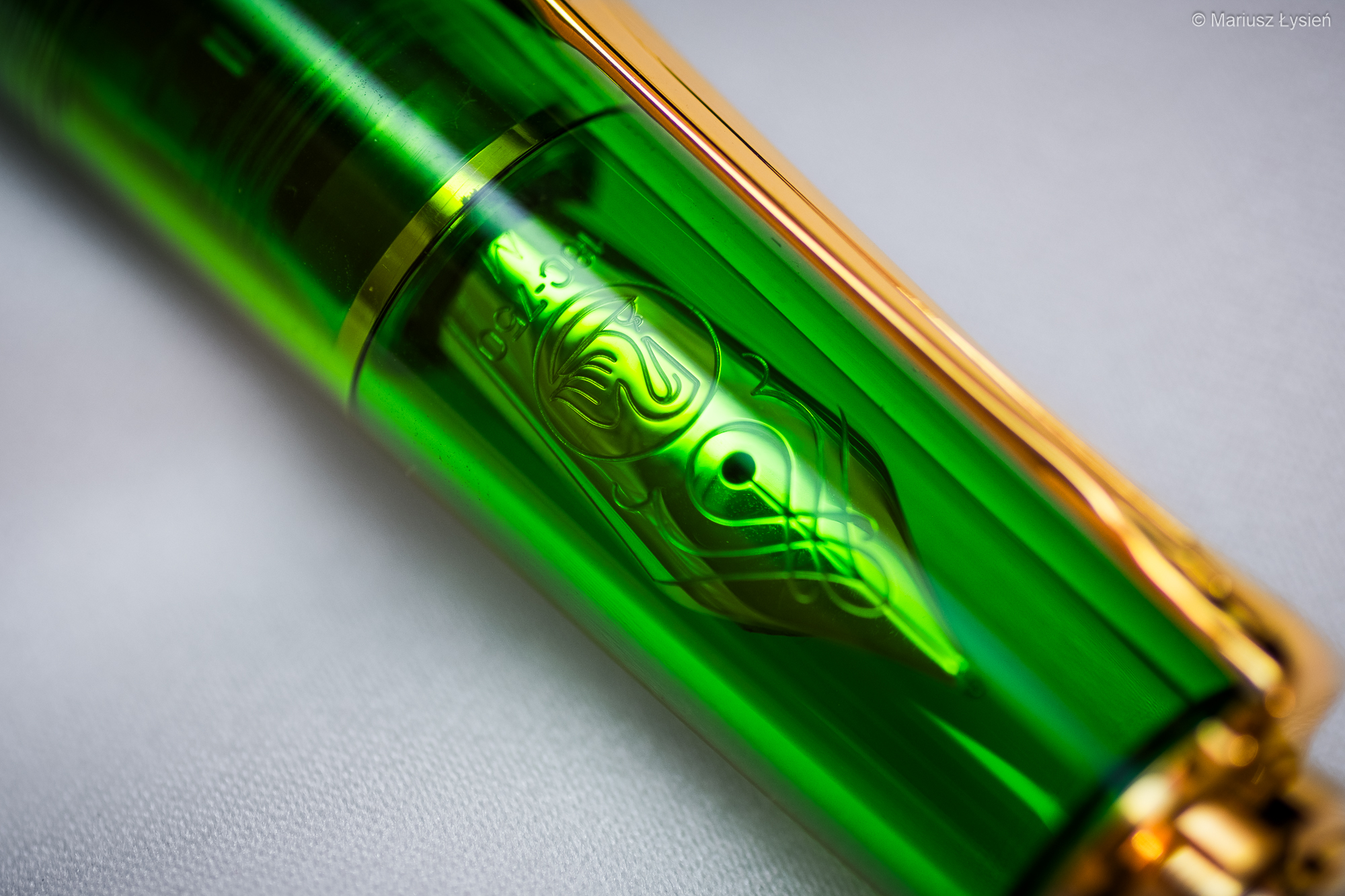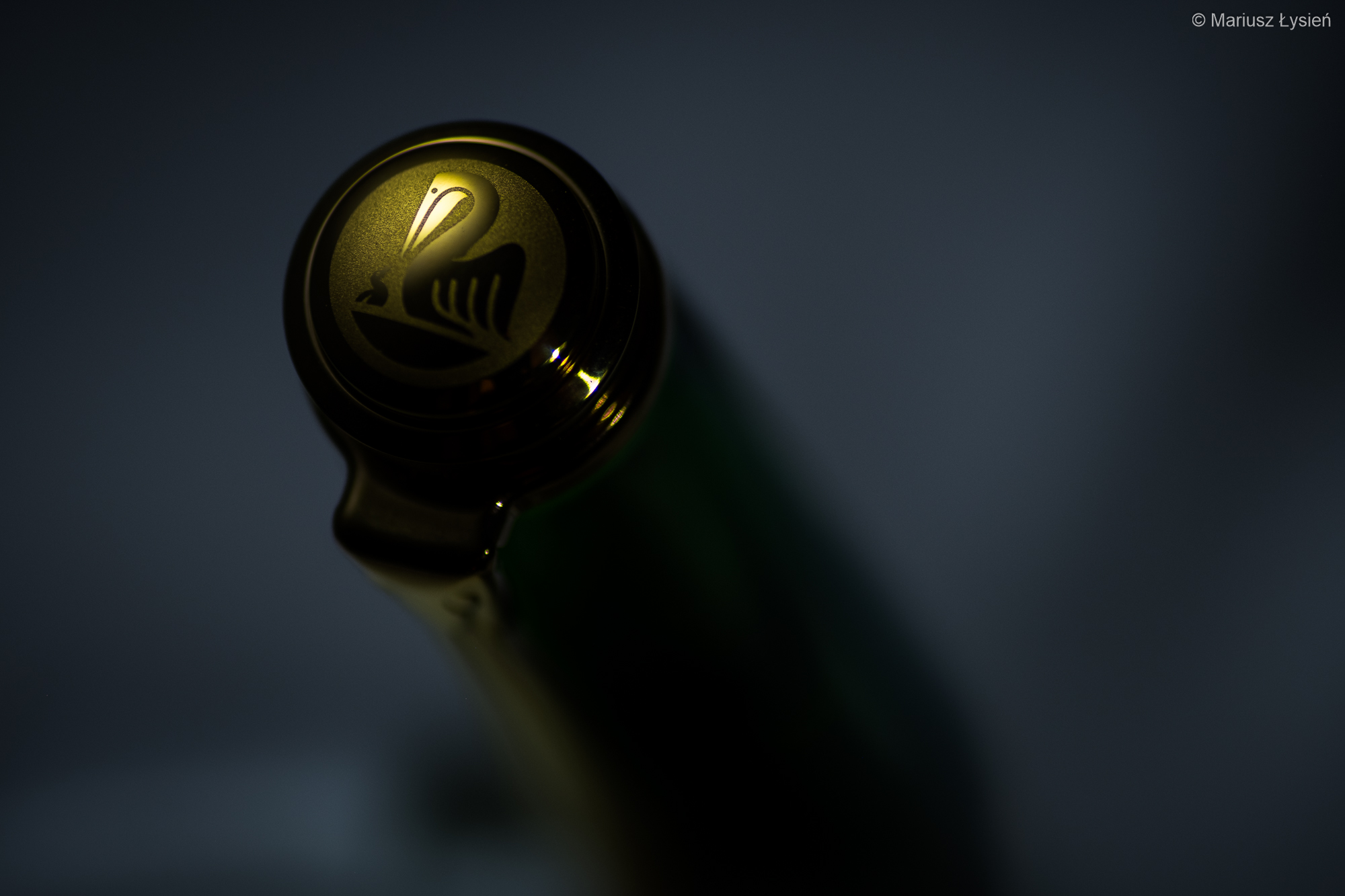 Co mogę napisać w porównaniu do powyższych o tytułowym wariancie? Z pewnością jest to pióro dosyć specyficzne. Nie każdemu przypadnie do gustu tak mocno transparentne pióro, podobnie jak jego kolorystyka. Mnie urzekło do tego stopnia, że decyzja o zakupie była wręcz błyskawiczna – w tym miejscu jeszcze raz chciałem podziękować niezawodnemu sklepowi Twoje Pióro. Odcień zieleni wraz z pozłacanymi elementami metalowymi tworzy fantastyczne wrażenie. Barwa jest żywa i dokładnie taka jakiej bym oczekiwał – tzn odcień zieleni nie jest przesunięty w stronę żółtej ani tym bardziej niebieskiej dominanty. Bardzo lubię przybory piśmiennicze, które są kolorowe, dlatego tytułowe pióro urzekło mnie od razu. Doceniam „klasyczną czerń” jednak jest ona u mnie często jednym z ostatnich wyborów jeżeli chodzi o pióra wieczne. Wszystkie elementy gwintowane pracują bardzo dobrze – w przypadku wielu transparentnych materiałów odnosiłem wielokrotnie wrażenie, że mają one inną, nieco twardszą charakterystykę i nie pracują tak płynnie. W tym przypadku Pelikan poradził sobie bardzo dobrze. Sama żywica jest zresztą bardzo przyjemna w dotyku.