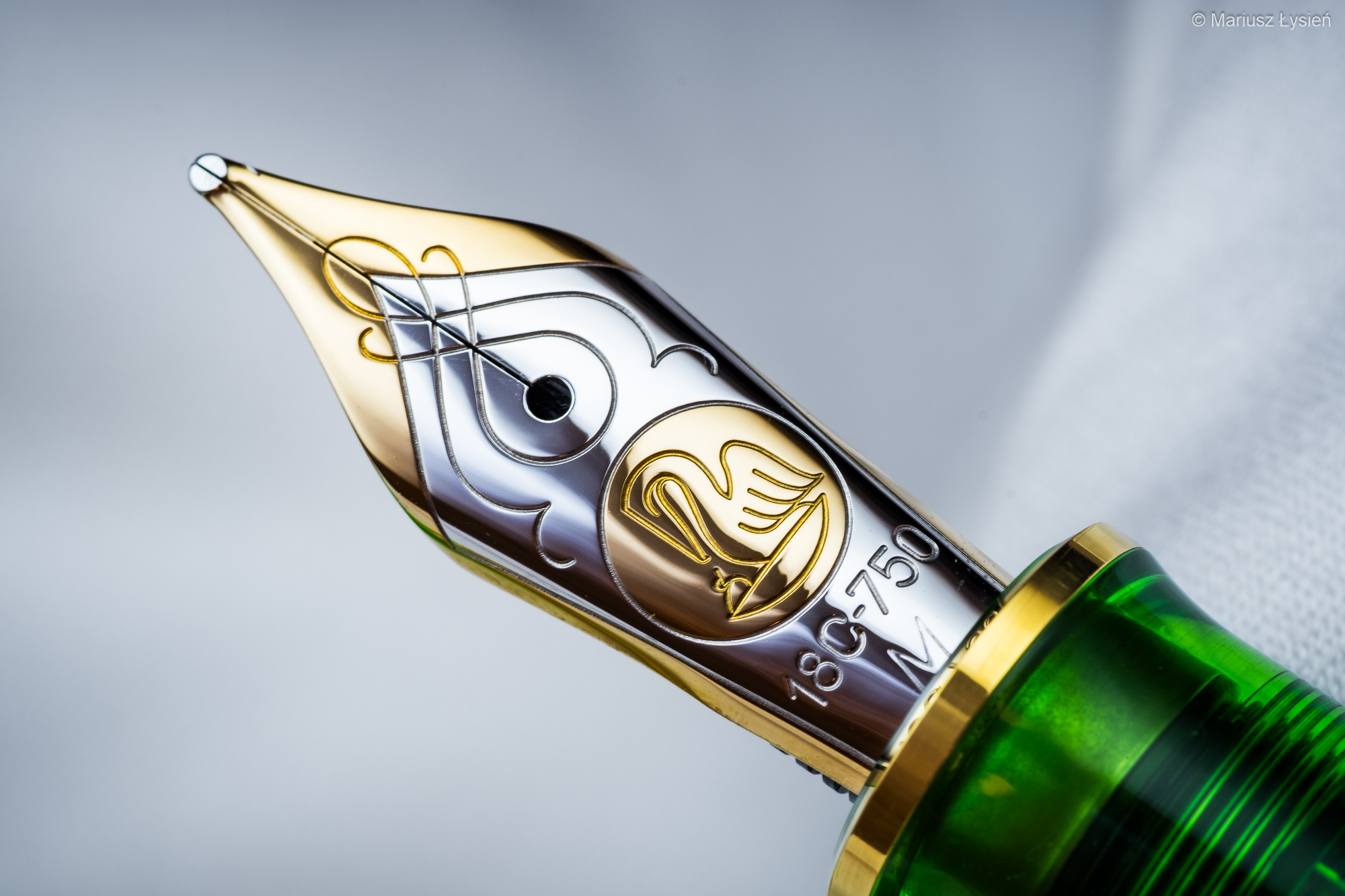Wykonana z 18 karatowego złota, dwukolorowa stalówka w rozmiarze M pisze typowo dla piór Pelikan. Jest dosyć szeroko i soczyście, czyli tak jak lubię. Jeżeli oczekujecie cienkiej linii to wsród stalówek Pelikan polecam zainteresować się przede wszystkim gradacją EF. Ogromną zaletą pomagającą w czyszczeniu pióra jest łatwa możliwość wykręcenia stalówki.