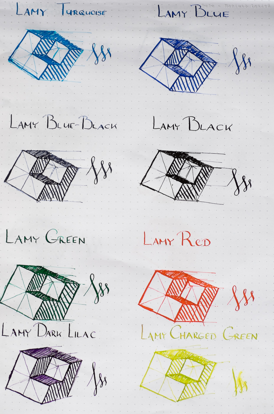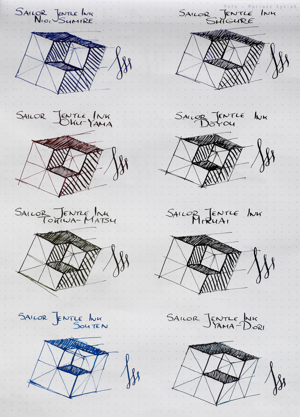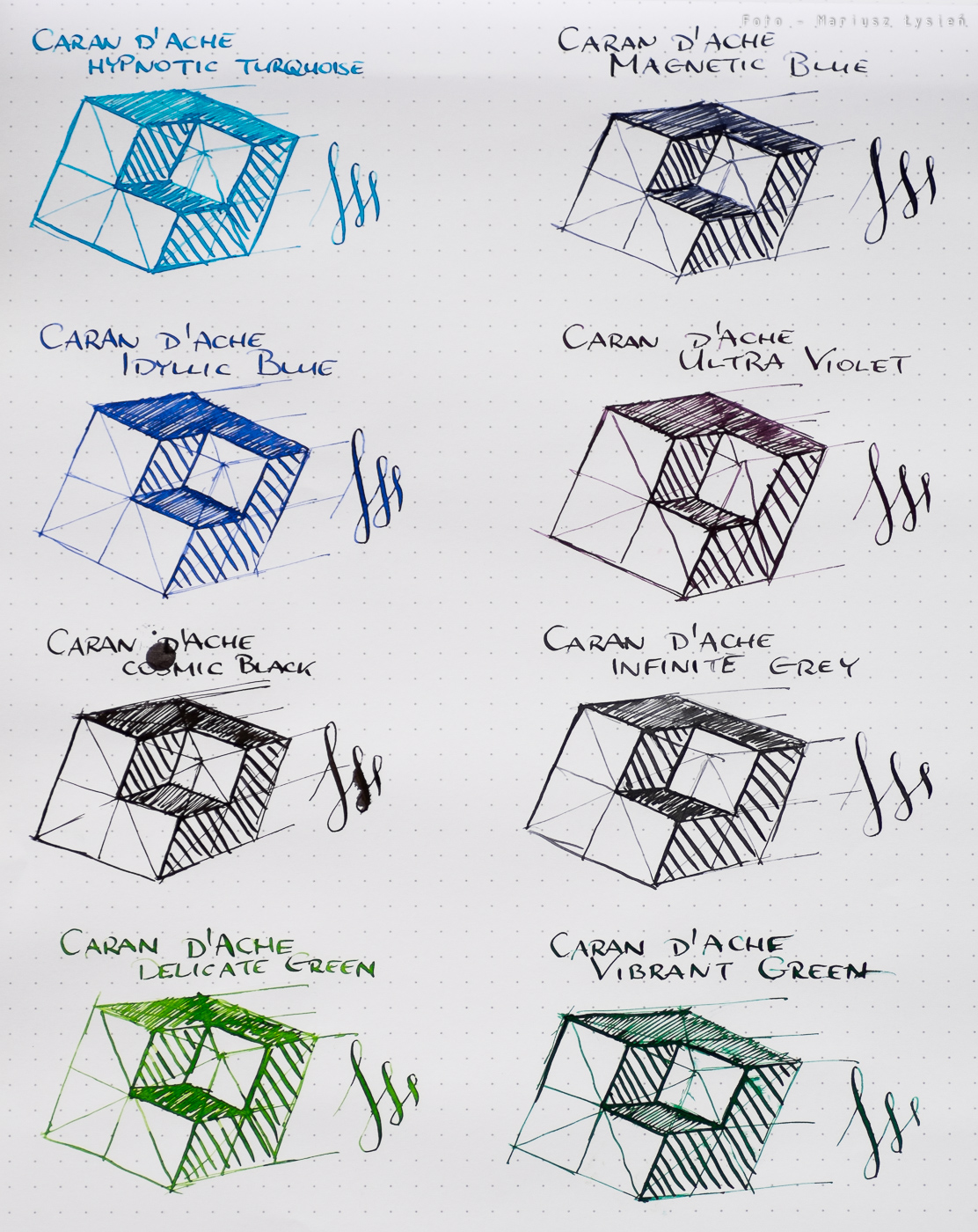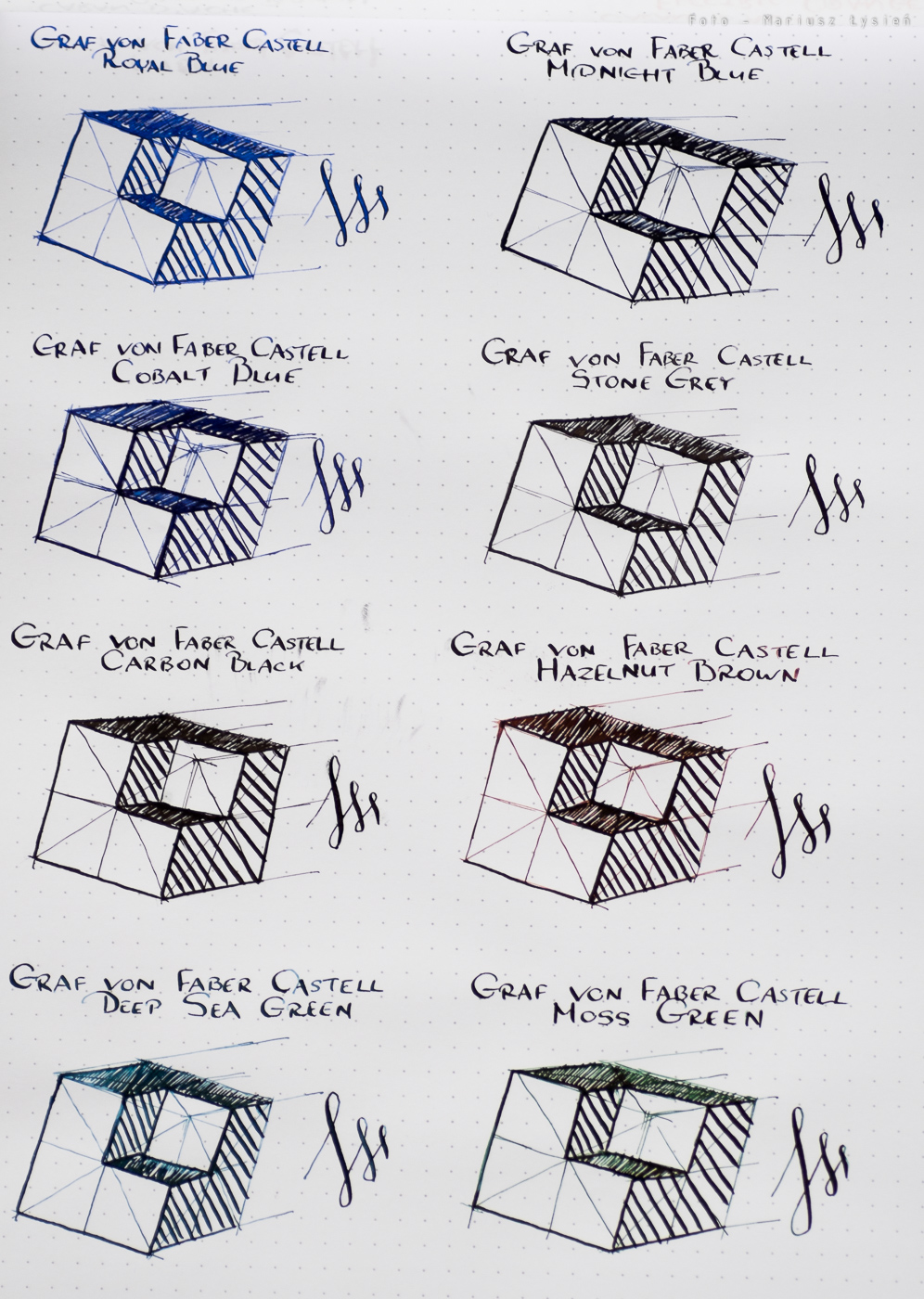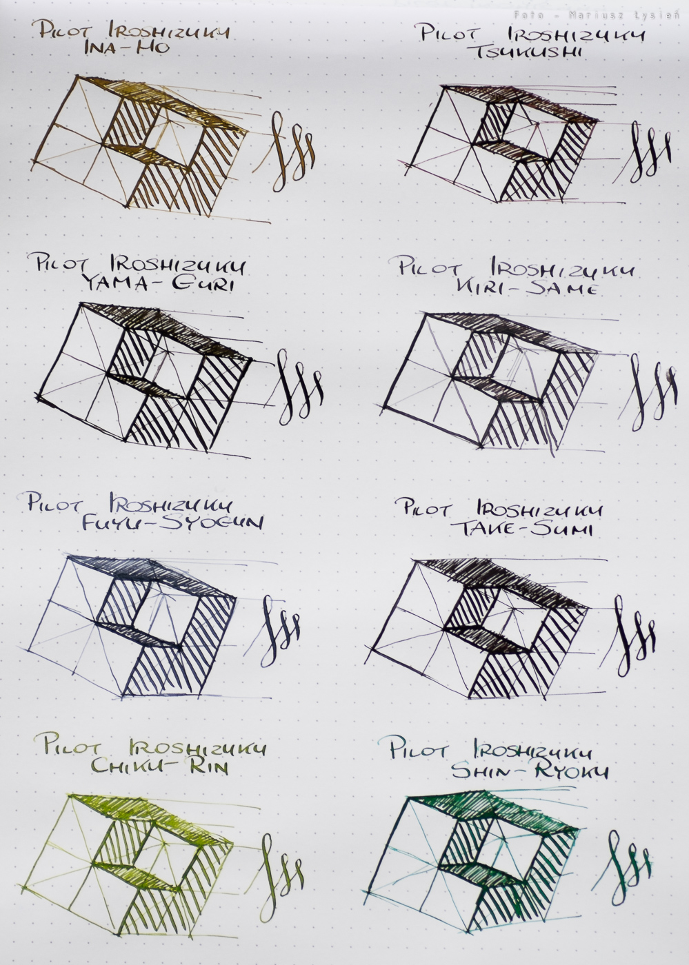 Zestawienie zostało wykonane przy pomocy stalówki umocowanej w obsadce. Za podłoże posłużył papier notesu Rhodia DotPad w formacie A4.