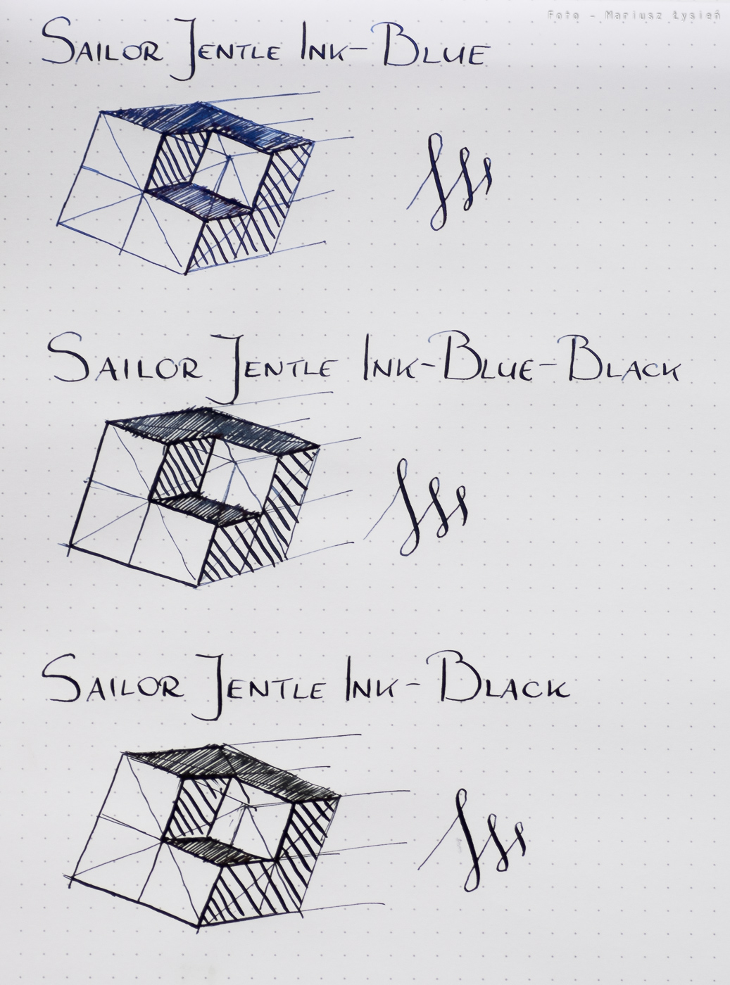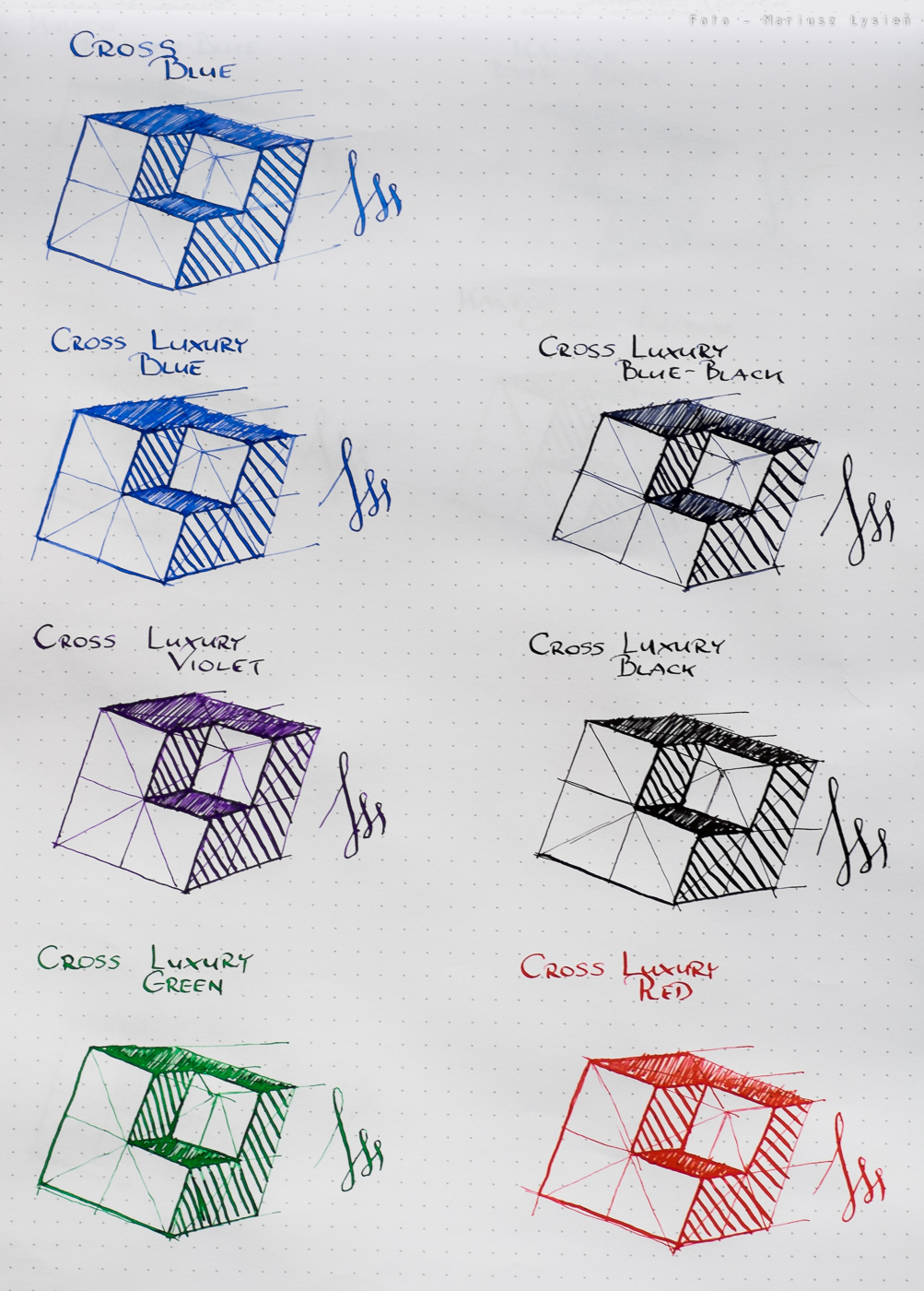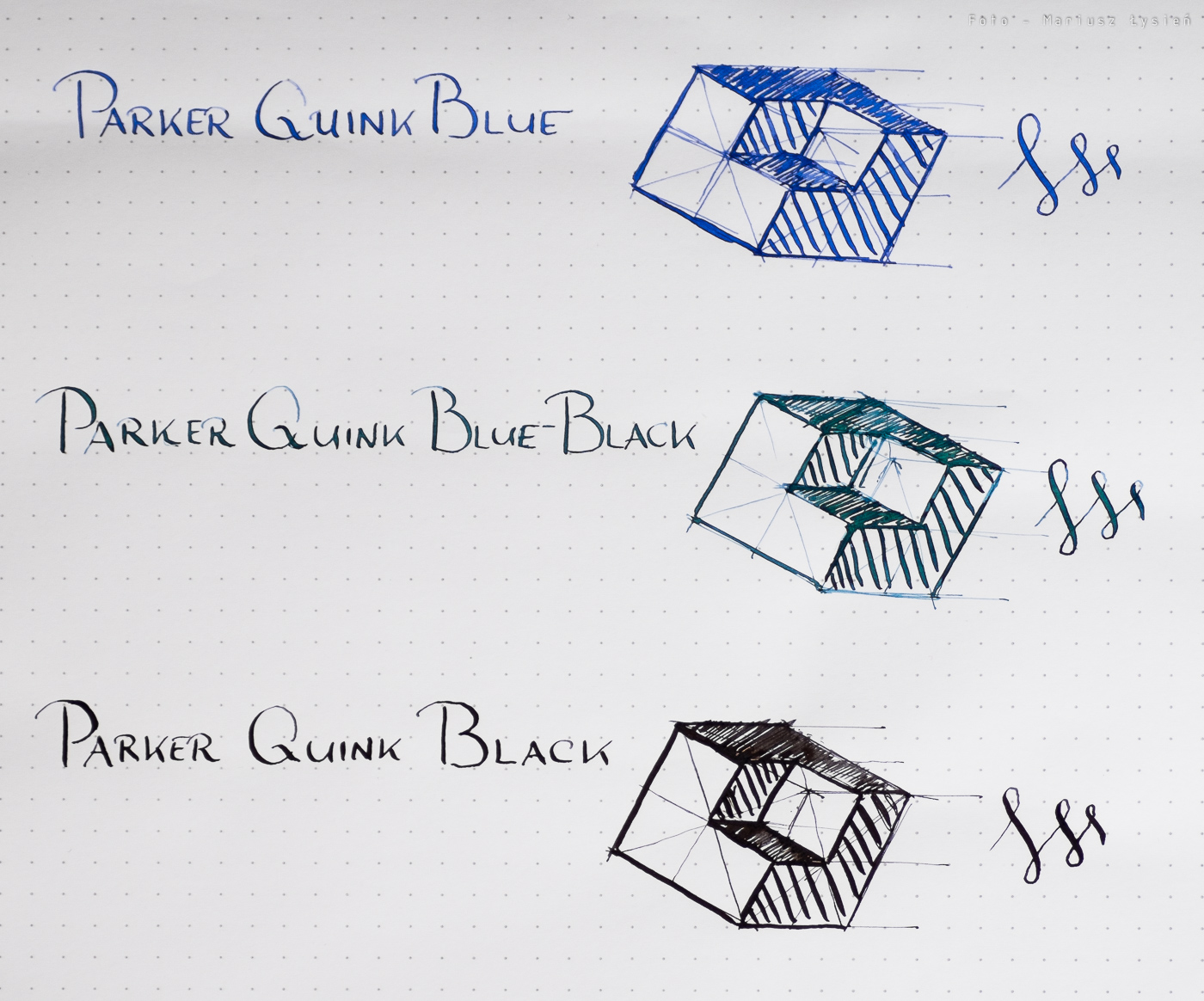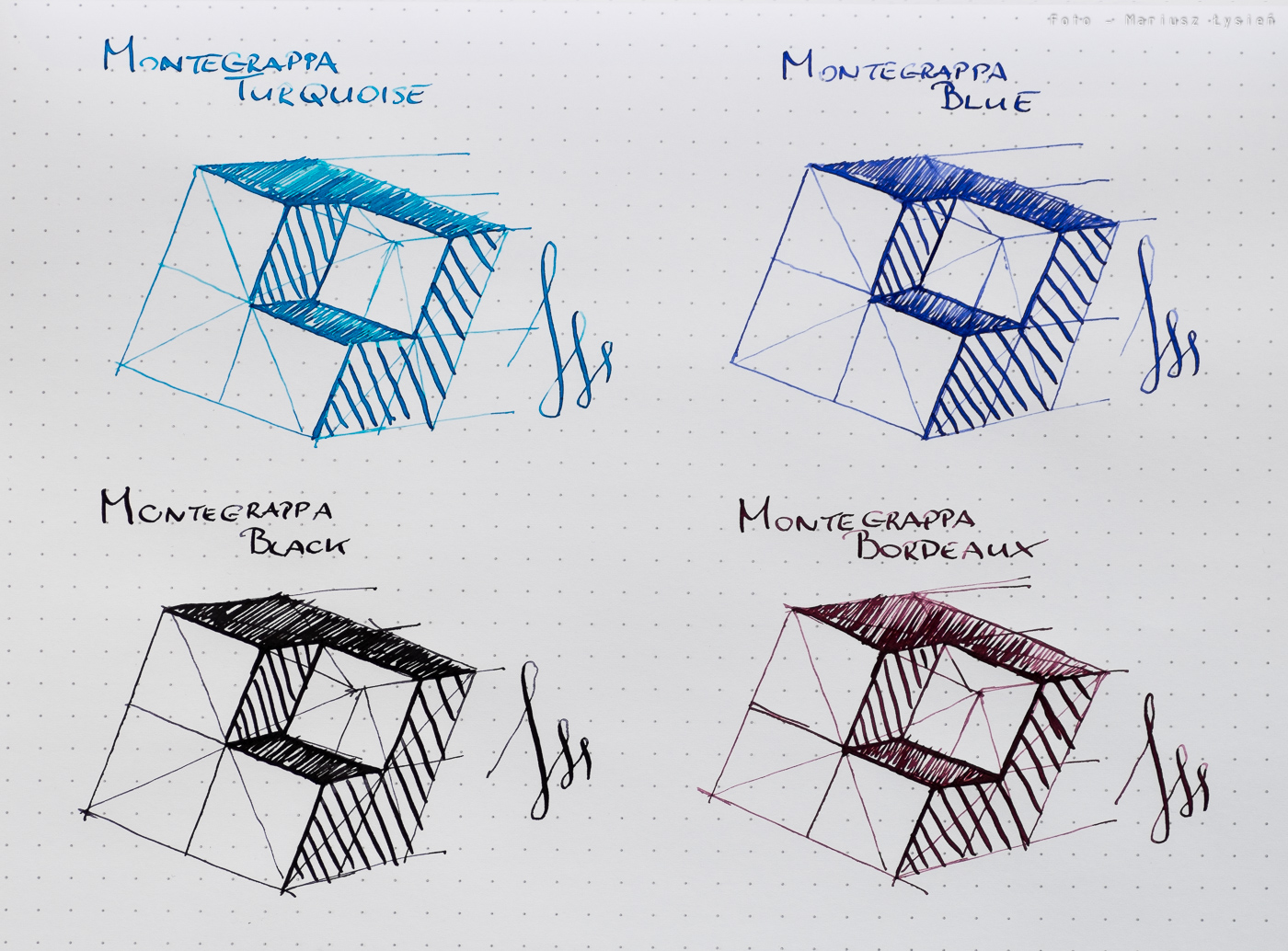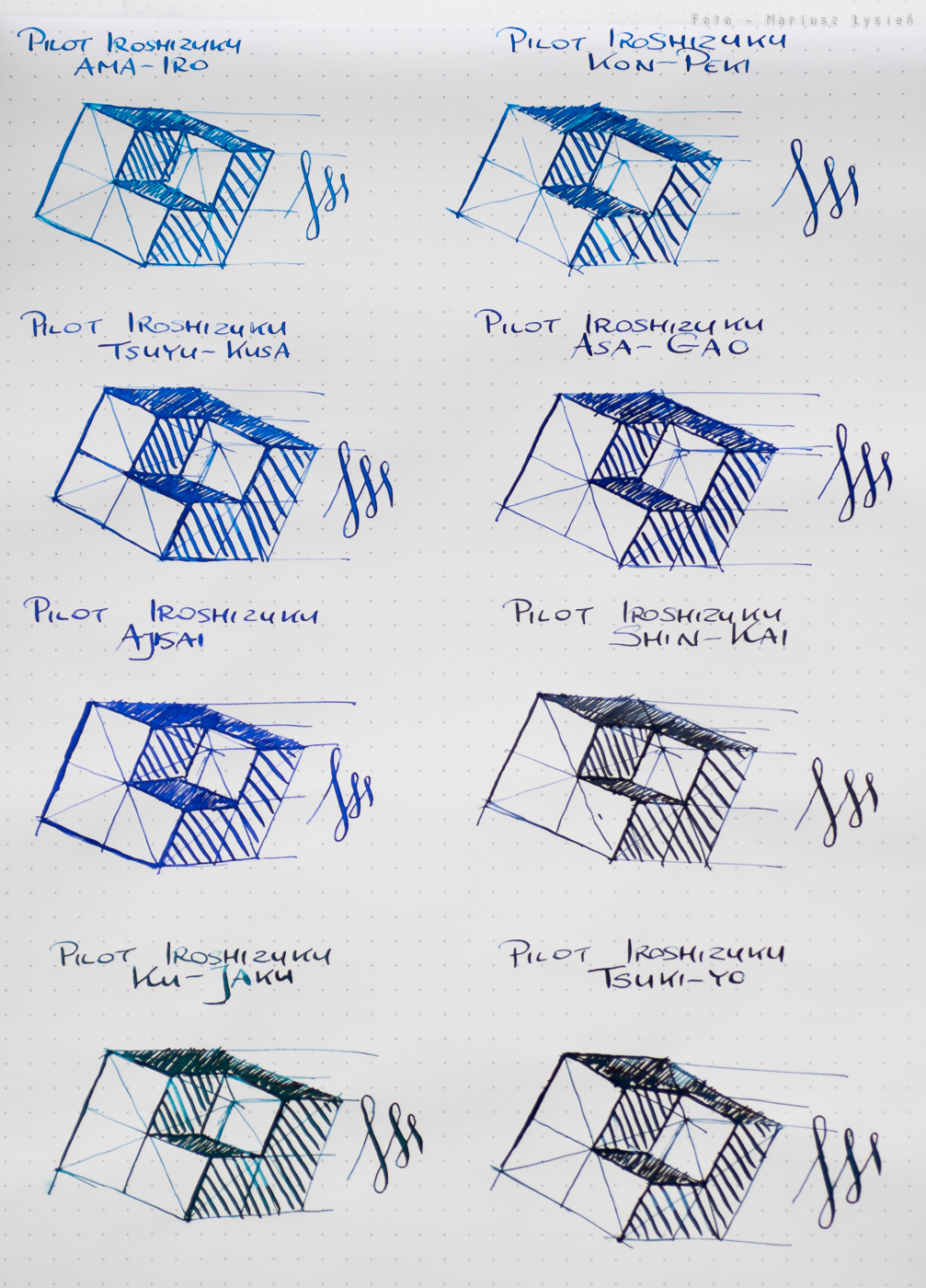 Zestawienie zostało wykonane przy pomocy stalówki umocowanej w obsadce. Za podłoże posłużył papier notesu Rhodia DotPad w formacie A4.