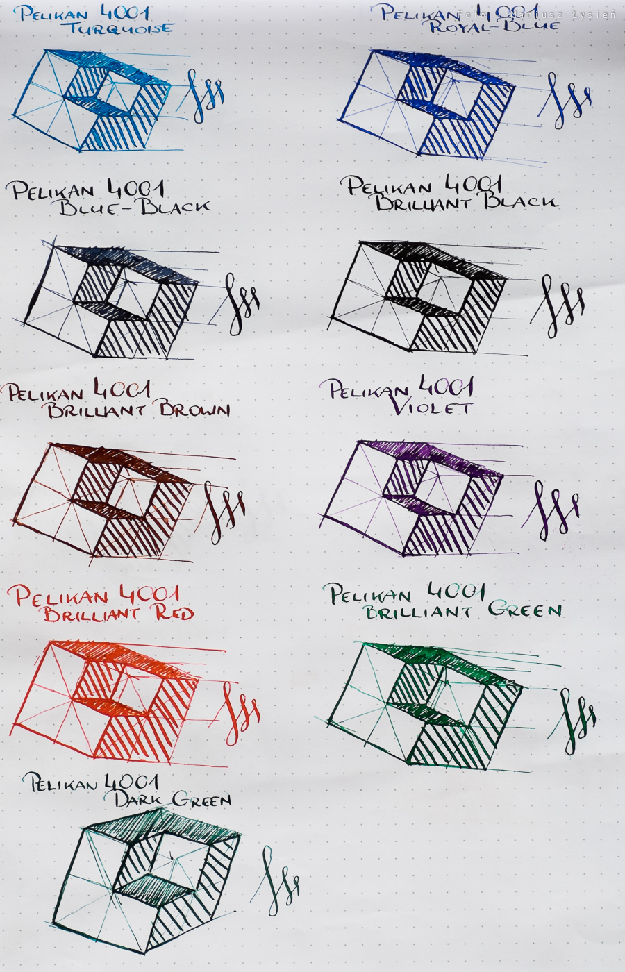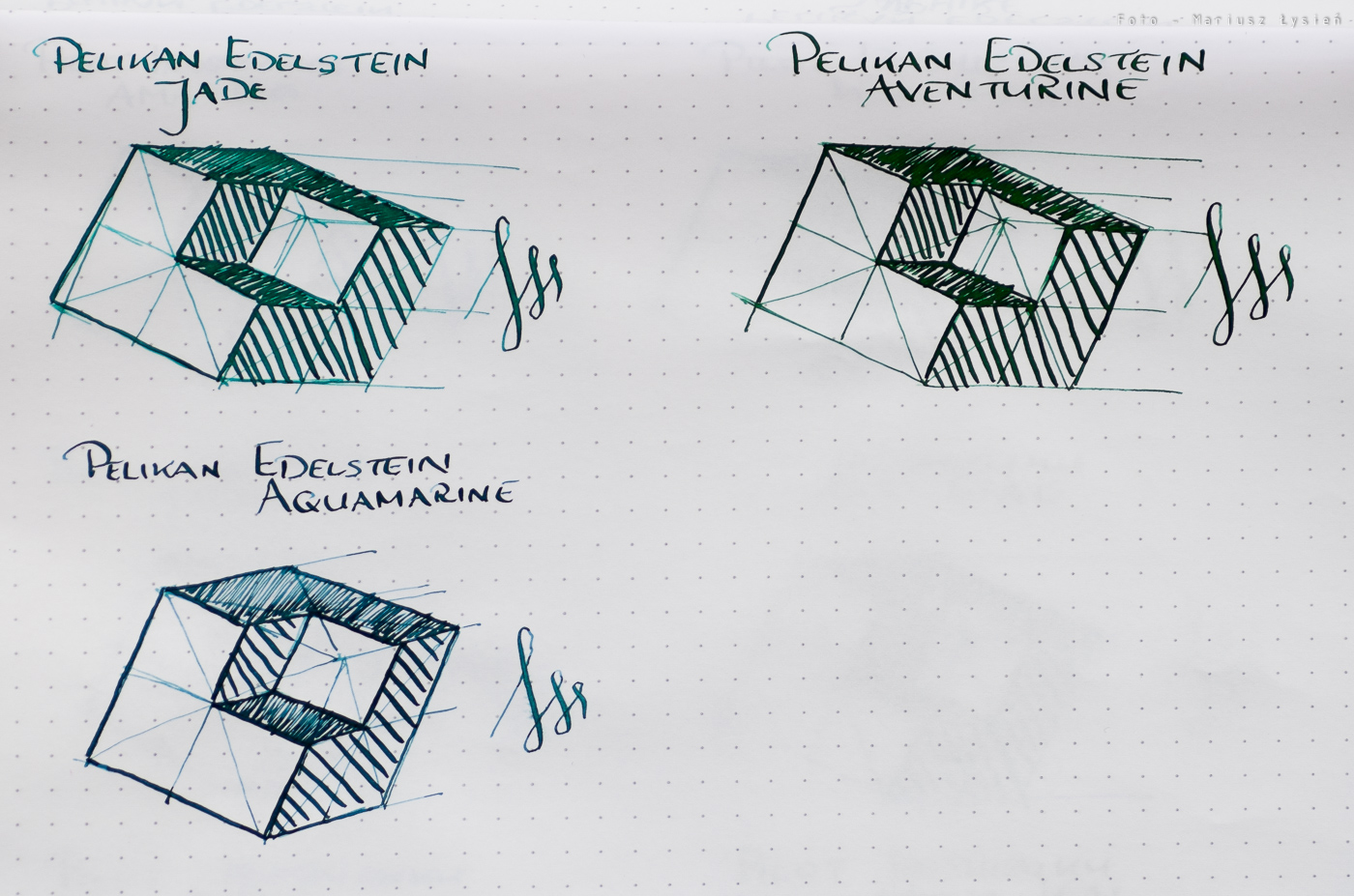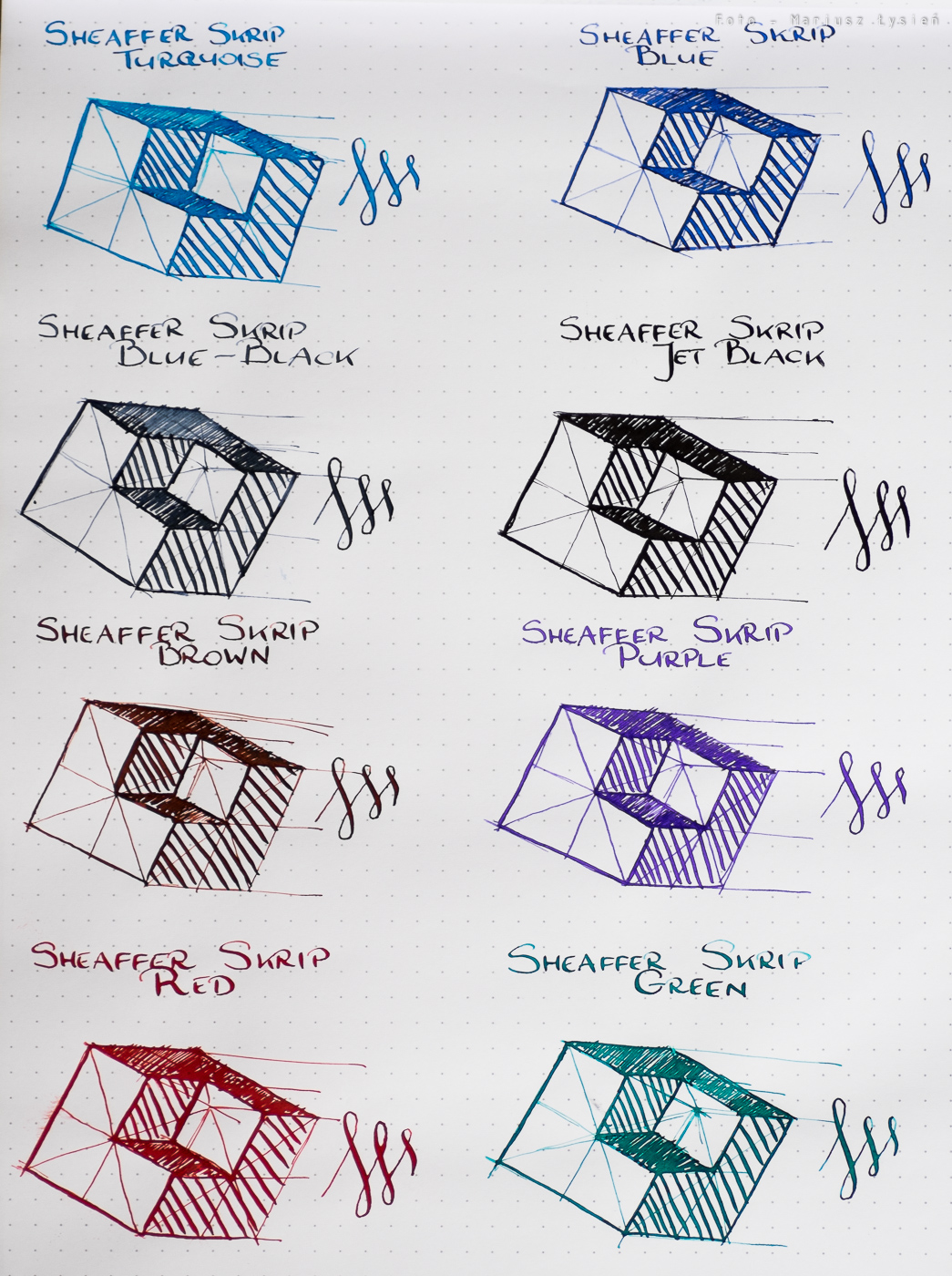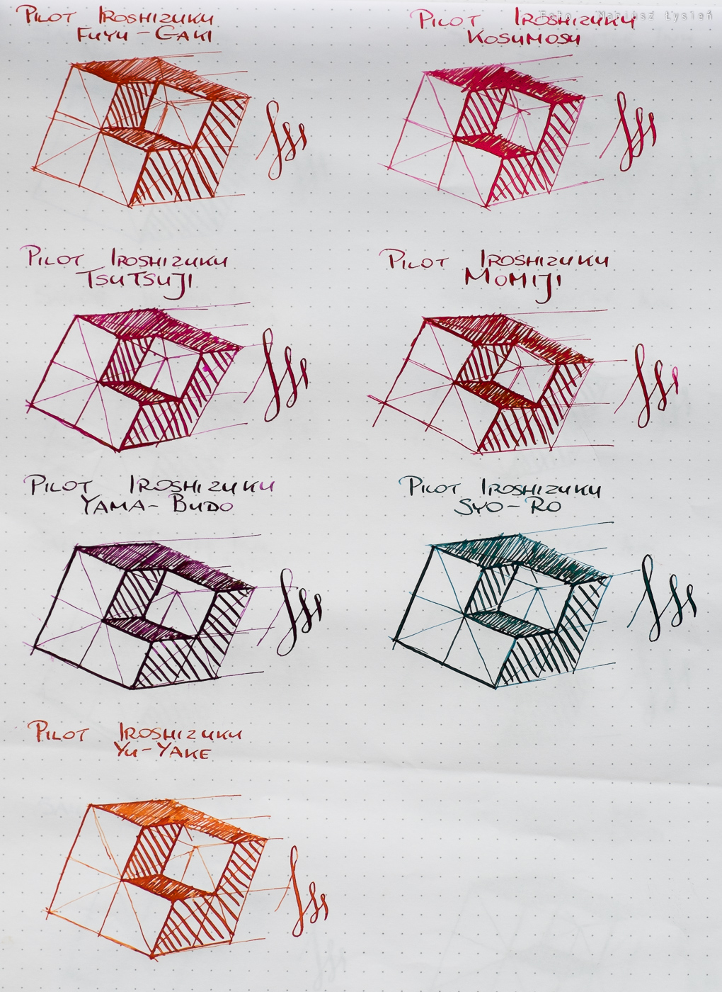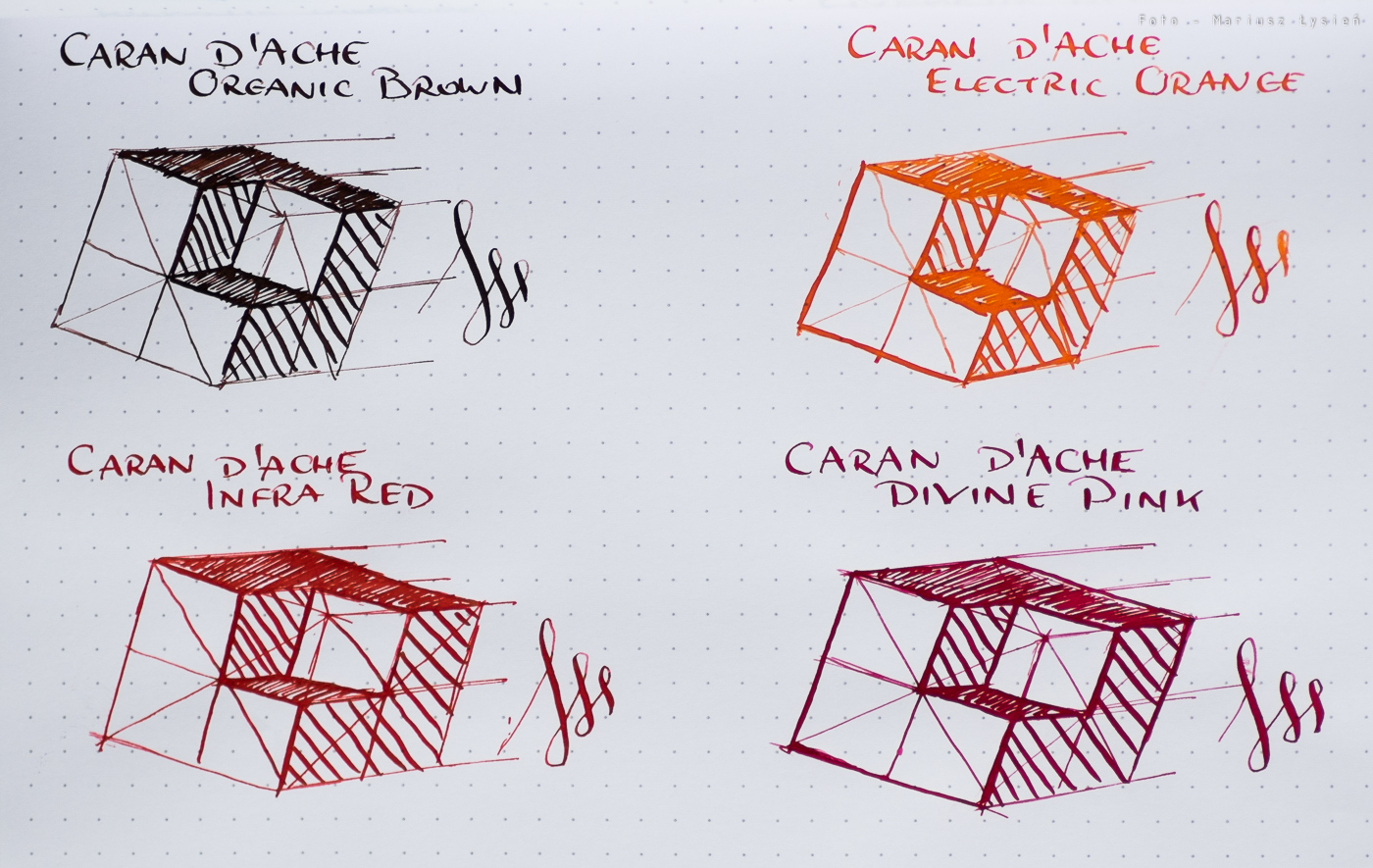 Zestawienie zostało wykonane przy pomocy stalówki umocowanej w obsadce. Za podłoże posłużył papier notesu Rhodia DotPad w formacie A4.